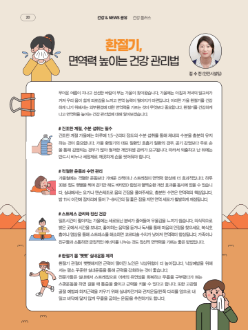 %ud658%uc808%uae30,%uba74%uc5ed%ub825 %ub192%uc774%ub294 %uac74%uac15 %uad00%ub9ac%ubc95%ubb34%ub354%uc6b4 %uc5ec%ub984%uc774 %uc9c0%ub098%uace0 %uc120%uc120%ud55c %ubc14%ub78c%uc774 %ubd80%ub294 %uac00%uc744%uc774 %ucc3e%uc544%uc654%uc2b5%ub2c8%ub2e4. %uac00%uc744%uc5d0%ub294 %uc544%uce68%uacfc %uc800%ub141%uc758 %uc77c%uad50%ucc28%uac00 %ucee4%uc838 %uc6b0%ub9ac %ubab8%uc774 %uc27d%uac8c %ud53c%ub85c%uac10%uc744 %ub290%ub07c%uace0 %uba74%uc5ed %ub2a5%ub825%uc774 %ub5a8%uc5b4%uc9c0%uae30 %ub9c8%ub828%uc785%ub2c8%ub2e4. %uc774%ub7ec%ud55c %uac00%uc744 %ud658%uc808%uae30%ub97c %uac74%uac15%ud558%uac8c %ub098%uae30 %uc704%ud574%uc11c%ub294 %uc678%ubd80%ud658%uacbd%uc5d0 %ub300%ud55c %uba74%uc5ed%ub825%uc744 %uae30%ub974%ub294 %uac83%uc774 %ubb34%uc5c7%ubcf4%ub2e4 %uc911%uc694%ud569%ub2c8%ub2e4. %ud658%uc808%uae30%ub97c %uac74%uac15%ud558%uac8c %ub098%uace0 %uba74%uc5ed%ub825%uc744 %ub192%uc774%ub294 %uac74%uac15 %uad00%ub9ac%ubc95%uc5d0 %ub300%ud574 %uc54c%uc544%ubcf4%uaca0%uc2b5%ub2c8%ub2e4.# %uac74%uc870%ud55c %uacc4%uc808, %uc218%ubd84 %uc12d%ucde8%ub294 %ud544%uc218%uac74%uc870%ud55c %uacc4%uc808 %uac00%uc744%uc5d0%ub294 %ud558%ub8e8%uc5d0 1.5~2%ub9ac%ud130 %uc815%ub3c4%uc758 %uc218%ubd84 %uc12d%ucde8%ub97c %ud1b5%ud574 %uccb4%ub0b4%uc758 %uc218%ubd84%uc744 %ucda9%ubd84%ud788 %uc720%uc9c0%ud558%ub294 %uac83%uc774 %uc911%uc694%ud569%ub2c8%ub2e4. %uac00%uc744 %ud658%uc808%uae30%uc758 %ub300%ud45c %uc9c8%ud658%uc778 %ud638%ud761%uae30 %uc9c8%ud658%uc758 %uacbd%uc6b0, %uacf5%uae30 %uac10%uc5fc%ubcf4%ub2e4 %uc8fc%ub85c %uc190%uc744 %ud1b5%ud574 %uac10%uc5fc%ub418%ub294 %uacbd%uc6b0%uac00 %ub9ce%uc544 %ucca0%uc800%ud55c %uac1c%uc778%uc704%uc0dd %uad00%ub9ac%uac00 %uc694%uad6c%ub429%ub2c8%ub2e4. %ub530%ub77c%uc11c %uc678%ucd9c%ud558%uace0 %ub09c %ub4a4%uc5d0%ub294 %ubc18%ub4dc%uc2dc %ube44%ub204%ub098 %uc138%uc815%uc81c%ub85c %uae68%ub057%ud558%uac8c %uc190%uc744 %uc53b%uc5b4%uc918%uc57c %ud569%ub2c8%ub2e4.# %uc801%uc808%ud55c %uc6b4%ub3d9%uacfc %uc218%uba74 %uad00%ub9ac%uac00%uc744%ucca0%uc5d0%ub294 %uaca9%ub82c%ud55c %uc6b4%ub3d9%ubcf4%ub2e4 %uac00%ubcbc%uc6b4 %uc0b0%ucc45%uc774%ub098 %uc2a4%ud2b8%ub808%uce6d%uc774 %uba74%uc5ed%ub825 %ud5a5%uc0c1%uc5d0 %ub354 %ud6a8%uacfc%uc801%uc785%ub2c8%ub2e4. %ud558%ub8e8 30%ubd84 %uc815%ub3c4 %ud587%ubcd5%uc744 %ucb10%uba70 %uac77%uae30%ub9cc %ud574%ub3c4 %ube44%ud0c0%ubbfcD %ud569%uc131%uacfc %ud608%uc561%uc21c%ud658 %uac1c%uc120 %ud6a8%uacfc%ub97c %ub3d9%uc2dc%uc5d0 %uc5bb%uc744 %uc218 %uc788%uc2b5%ub2c8%ub2e4. %uc2e4%ub0b4%uc5d0%uc11c%ub294 %uc694%uac00%ub098 %ub9e8%uc190%uccb4%uc870%ub85c %ubab8%uc758 %uae34%uc7a5%uc744 %ud480%uc5b4%uc8fc%uc138%uc694. %ucda9%ubd84%ud55c %uc218%uba74%uc740 %uba74%uc5ed%ub825%uc758 %ud575%uc2ec%uc785%ub2c8%ub2e4. %ubc24 11%uc2dc %uc774%uc804%uc5d0 %uc7a0%uc790%ub9ac%uc5d0 %ub4e4%uc5b4 7~8%uc2dc%uac04%uc758 %uc9c8 %uc88b%uc740 %uc7a0%uc744 %uc790%uba74 %uba74%uc5ed %uc138%ud3ec%uac00 %ud65c%ubc1c%ud558%uac8c %uc7ac%uc0dd%ub429%ub2c8%ub2e4.# %uc2a4%ud2b8%ub808%uc2a4 %uad00%ub9ac%uc640 %uc815%uc2e0 %uac74%uac15%uc77c%uc870%uc2dc%uac04%uc774 %uc9e7%uc544%uc9c0%ub294 %uac00%uc744%uc5d0%ub294 %uc138%ub85c%ud1a0%ub2cc %ubd84%ube44%uac00 %uc904%uc5b4%ub4e4%uc5b4 %uc6b0%uc6b8%uac10%uc744 %ub290%ub07c%uae30 %uc27d%uc2b5%ub2c8%ub2e4. %uc758%uc2dd%uc801%uc73c%ub85c %ubc1d%uc740 %uacf3%uc5d0%uc11c %uc2dc%uac04%uc744 %ubcf4%ub0b4%uace0, %uc88b%uc544%ud558%ub294 %uc74c%uc545%uc744 %ub4e3%uac70%ub098 %ub3c5%uc11c%ub97c %ud1b5%ud574 %ub9c8%uc74c%uc758 %uc548%uc815%uc744 %ucc3e%uc73c%uc138%uc694. %ubcf5%uc2dd%ud638%ud761%uc774%ub098 %uba85%uc0c1%uc744 %ud1b5%ud574 %uc2a4%ud2b8%ub808%uc2a4%ub97c %ud574%uc18c%ud558%uba74 %ucf54%ub974%ud2f0%uc194 %uc218%uce58%uac00 %ub0ae%uc544%uc838 %uba74%uc5ed%ub825%uc774 %ud5a5%uc0c1%ub429%ub2c8%ub2e4. %uac00%uc871%uc774%ub098 %uce5c%uad6c%ub4e4%uacfc %uc18c%ud1b5%ud558%uba74 %uae0d%uc815%uc801%uc778 %uc5d0%ub108%uc9c0%ub97c %ub098%ub204%ub294 %uac83%ub3c4 %uc815%uc2e0%uc801 %uba74%uc5ed%ub825%uc744 %uae30%ub974%ub294 %uc88b%uc740 %ubc29%ubc95%uc785%ub2c8%ub2e4.# %ud658%uc808%uae30 %ubab8 %u2018%ubee3%ubee3%u2019 %uc2e4%ub0b4%uc6b4%ub3d9 %uc81c%uaca9%ud658%uc808%uae30 %uad00%uc808%uc774 %ubee3%ubee3%ud574%uc9c0%uba74 %uadfc%ub825%uc774 %ub5a8%uc5b4%uc9c4 %ub178%uc778%uc740 %ub099%uc0c1%uc704%ud5d8%uc774 %ub354 %ub192%uc544%uc9d1%ub2c8%ub2e4. %ub099%uc0c1%uc608%ubc29%uc744 %uc704%ud574%uc11c%ub294 %ud3c9%uc18c %uafb8%uc900%ud55c %uc2e4%ub0b4%uc6b4%ub3d9%uc744 %ud1b5%ud574 %uadfc%ub825%uc744 %uac15%ud654%ud558%ub294 %uac83%uc774 %uc88b%uc2b5%ub2c8%ub2e4. %uc804%ubb38%uac00%ub4e4%uc740 %uc2e4%ub0b4%uc5d0%uc11c %uc2a4%ud2b8%ub808%uce6d%uc73c%ub85c %uc5b4%uae68%uc758 %uc720%uc5f0%uc131%uc744 %ud68c%ubcf5%ud558%uace0 %ubb34%ub98e%uc744 %uad6c%ubd80%ub838%ub2e4%uac00 %ud3b4%ub294 %uc2a4%ucf83%uc6b4%ub3d9%uc744 %ud558%uba74 %uac78%uc744 %ub54c %ud1b5%uc99d%uc744 %uc904%uc774%uace0 %uadfc%ub825%uc744 %ud0a4%uc6b8 %uc218 %uc788%ub2e4%uace0 %ud569%ub2c8%ub2e4. %ub610%ud55c %uace0%uad00%uc808%uace8%uc808 %uc608%ubc29%uacfc %ud558%uc9c0%uadfc%ub825%uc744 %ud0a4%uc6b0%uae30 %uc704%ud574 %uc2e4%ub0b4%uc790%uc804%uac70%uc640 %ub7f0%uc9c0%uc6b4%ub3d9(%ud55c%ucabd %ub2e4%ub9ac%ub97c %uc55e%uc73c%ub85c %ub0b4%ubc00%uace0 %ubc14%ub2e5%uc5d0 %ub2ff%uc9c0 %uc54a%uac8c %ubb34%ub98e%uc744 %uad7d%ud788%ub294 %uc6b4%ub3d9)%uc744 %ucd94%ucc9c%ud558%uae30%ub3c4 %ud569%ub2c8%ub2e4.%uae40 %uc218 %uc9c4 (%uc548%uc804%uc2dc%uc124%ud300)20 %uac74%uac15 & NEWS %uacf5%uc720 %uac74%uac15 %ud50c%ub7ec%uc2a4
