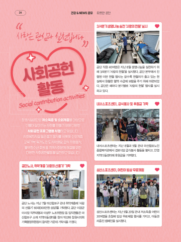 %ucc3d%uc6d0%uc2dc%uc124%uacf5%ub2e8%uc740 %uc800%uc18c%ub4dd%uce35 %ubc0f %uc18c%uc678%uacc4%uce35%uc744 %ub300%uc0c1%uc73c%ub85c %ub354%ubd88%uc5b4 %uc0b4%uc544%uac00%ub294 %uc0ac%ud68c%ub97c %ub9cc%ub4e4%uae30 %uc704%ud574 %ub2e4%uc591%ud55c%uc0ac%ud68c%uacf5%ud5cc %ud504%ub85c%uadf8%ub7a8%uc744 %uc2dc%ud589%ud558%uace0 %uc788%uc2b5%ub2c8%ub2e4. %uc0ac%ud68c%ubcf5%uc9c0%uc2dc%uc124 %uc77c%uc190%ub3d5%uae30 %ubd09%uc0ac%ub97c %ube44%ub86f%ud574 %uc18c%uc678%uacc4%uce35 %uad50%uc721%uae30%ubd80, %ub3c5%uac70%ub178%uc778 %ub3c4%uc2dc%ub77d%ubc30%ub2ec, %uae09%uc2dd %uc790%uc6d0%ubd09%uc0ac, %ubd88%uc6b0%uccad%uc18c%ub144 %ud6c4%uc6d0 %ub4f1 %uc9c0%uc5ed%uc0ac%ud68c%ubb38%uc81c %ud574%uacb0%uc744 %uc704%ud55c %ub2e4%uc591%ud55c %uc0ac%ud68c%uacf5%ud5cc%ud65c%ub3d9%uc744 %uc2e4%ucc9c%ud558%uace0 %uc788%uc2b5%ub2c8%ub2e4.%u201c%uc0ac%ub791%uc740 %uad00%uc2ec%uacfc %uc2e4%ucc9c%uc785%ub2c8%ub2e4 %u201cSocial contribution activities%uc0ac%ud68c%uacf5%ud5cc%ud65c%ub3d9%uacf5%ub2e8 %uc9c1%uc6d0 40%uc5ec%uba85%uc740 %uc9c0%ub09c 8%uc6d4 %uc0dd%uba85%ub098%ub214%uc744 %uc2e4%ucc9c%ud558%uae30 %uc704%ud574 3/4%ubd84%uae30 %u2018%uc0ac%ub791%uc758 %ud5cc%ud608%u2019%uc744 %uc2e4%uc2dc%ud588%ub2e4. %uacf5%ub2e8 %ubcf8%ubd80%uc5d0%uc11c %uc9c4%ud589%ub41c %uc774%ubc88 %ud5cc%ud608 %ud589%uc0ac%ub294 %uac08%uc218%ub85d %ud5cc%ud608%uc790%uac00 %uc904%uace0 %uc788%ub294 %ud604%uc2e4%uc5d0%uc11c %uc6d0%ud65c%ud55c %ud608%uc561 %uc218%uae09%uc5d0 %ubcf4%ud0ec%uc744 %uc8fc%uae30 %uc704%ud574 %ub9c8%ub828%ub418%uc5c8%ub2e4. %uacf5%ub2e8%uc740 %ud574%ub9c8%ub2e4 %ubd84%uae30%ubcc4%ub85c %u2018%uc0ac%ub791%uc758 %ud5cc%ud608%u2019 %ud589%uc0ac%ub97c %uc2e4%uc2dc%ud558%uace0 %uc788%ub2e4.%ub0b4%uc11c%uc2a4%ud3ec%uce20%uc13c%ud130%ub294 %uc9c0%ub09c 8%uc6d4%uacfc 9%uc6d4 %uad00%ub0b4 %ub9c8%uc0b0%ud569%ud3ec%ub178%uc778%uc885%ud569%ubcf5%uc9c0%uad00%uc5d0%uc11c %uacbd%ub85c%uc2dd%ub2f9 %uae09%uc2dd%ubd09%uc0ac %ud65c%ub3d9%uc744 %ud3bc%uce58%uace0, %uc548%uc601%uc9c0%uc5ed%ub2e4%ub3d9%uc13c%ud130%uc5d0 %ud6c4%uc6d0%uae08%uc744 %uae30%ubd80%ud588%ub2e4.%uc131%uc0b0%uc2a4%ud3ec%uce20%uc13c%ud130%ub294 %uc9c0%ub09c 9%uc6d4 20%uc77c %uad00%ub0b4 %uc800%uc18c%ub4dd%uce35 %uc5b4%ub9b0%uc774 30%uc5ec%uba85%uc744 %ucd08%uccad%ud574 %ube59%uc0c1 %ubb34%ub8cc%uccb4%ud5d8 %ud589%uc0ac%ub97c %uac00%uc9c0%uace0, %uc544%ub3d9%uad8c%ub9ac%uc99d%uc9c4 %ucea0%ud398%uc778%uc744 %uc2e4%uc2dc%ud588%ub2e4.%uacf5%ub2e8 %ub178%uc0ac%ub294 %uc9c0%ub09c 7%uc6d4 %ub9c8%uc0b0%ud569%ud3ec%uad6c %uad00%ub0b4 %ucde8%uc57d%uacc4%uce35%uc5d0 %u2018%uc0ac%ub791%uc758 %uc120%ud48d%uae30%u2019 60%ub300(300%ub9cc%uc6d0 %uc0c1%ub2f9)%u2019%ub97c %uae30%ud0c1%ud588%ub2e4. %uacf5%ub2e8 %uc774%uacbd%uade0 %uc774%uc0ac%uc7a5 %uc9c1%ubb34%ub300%ud589%uacfc %uc774%uc131%uc6b0 %ub178%uc870%uc704%uc6d0%uc7a5 %ub4f1 %uc784%uc9c1%uc6d0%ub4e4%uc740 %ub9c8%uc0b0%ud569%ud3ec%uad6c %uc18c%uc7ac %uc9c0%uc5ed%uc544%ub3d9%uc13c%ud130%ub97c %ucc3e%uc544 %ubc15%uc120%uc560 %ucc3d%uc6d0%uc2dc%uc758%ud68c %uae30%ud68d%ud589%uc815%uc704%uc6d0%uc7a5%uc774 %ucc38%uc11d%ud55c %uac00%uc6b4%ub370 %uae30%ud0c1%uc2dd%uc744 %uac00%uc84c%ub2e4.3/4%ubd84%uae30 %uc0dd%uba85%ub098%ub214 %uc2e4%ucc9c %u2018%uc0ac%ub791%uc758 %ud5cc%ud608%u2019 %uc2e4%uc2dc%ub0b4%uc11c%uc2a4%ud3ec%uce20%uc13c%ud130, %uae09%uc2dd%ubd09%uc0ac %ubc0f %ud6c4%uc6d0%uae08 %uae30%ud0c1%uc131%uc0b0%uc2a4%ud3ec%uce20%uc13c%ud130, %uc5b4%ub9b0%uc774 %ube59%uc0c1 %ubb34%ub8cc%uccb4%ud5d8%uacf5%ub2e8%ub178%uc0ac, %ucde8%uc57d%uacc4%uce35 %u2018%uc0ac%ub791%uc758 %uc120%ud48d%uae30%u2019 %uae30%ud0c124 %uac74%uac15 & NEWS %uacf5%uc720 %ub530%ub73b%ud55c %uacf5%ub2e8
