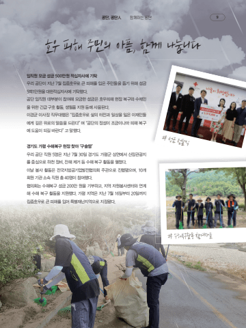 # %uc131%uae08 %uc804%ub2ec%uc2dd# %uc218%ud574%ubcf5%uad6c%ud65c%ub3d9 %ucc38%uc5ec%uc790%ub4e4%ud638%uc6b0 %ud53c%ud574 %uc8fc%ubbfc%uc758 %uc544%ud514, %ud568%uaed8 %ub098%ub215%ub2c8%ub2e4%uc784%uc9c1%uc6d0 %ubaa8%uae08 %uc131%uae08 500%ub9cc%uc6d0 %uc801%uc2ed%uc790%uc0ac%uc5d0 %uae30%ud0c1%uc6b0%ub9ac %uacf5%ub2e8%uc774 %uc9c0%ub09c 7%uc6d4 %uc9d1%uc911%ud638%uc6b0%ub85c %ud070 %ud53c%ud574%ub97c %uc785%uc740 %uc8fc%ubbfc%ub4e4%uc744 %ub3d5%uae30 %uc704%ud574 %uc131%uae08 5%ubc311%ub9cc%uc6d0%uc744 %ub300%ud55c%uc801%uc2ed%uc790%uc0ac%uc5d0 %uae30%ud0c1%ud588%ub2e4.%uacf5%ub2e8 %uc784%uc9c1%uc6d0 %ub300%ubd80%ubd84%uc774 %ucc38%uc5ec%ud574 %ubaa8%uae08%ud55c %uc131%uae08%uc740 %ud638%uc6b0%ud53c%ud574 %ud604%uc7a5 %ubcf5%uad6c%uc640 %uc218%uc7ac%ubbfc%uc744 %uc704%ud55c %uae34%uae09 %uad6c%ud638 %ud65c%ub3d9, %uc0dd%ud544%ud488 %uc9c0%uc6d0 %ub4f1%uc5d0 %uc0ac%uc6a9%ub41c%ub2e4.%uc774%uacbd%uade0 %uc774%uc0ac%uc7a5 %uc9c1%ubb34%ub300%ud589%uc740 %u201c%uc9d1%uc911%ud638%uc6b0%ub85c %uc0b6%uc758 %ud130%uc804%uacfc %uc77c%uc0c1%uc744 %uc783%uc740 %uc774%uc7ac%ubbfc%ub4e4%uc5d0%uac8c %uae4a%uc740 %uc704%ub85c%uc758 %ub9d0%uc500%uc744 %ub4dc%ub9b0%ub2e4%u201d %uba70 %u201c%uacf5%ub2e8%uc758 %uc815%uc131%uc774 %uc870%uae08%uc774%ub098%ub9c8 %ud53c%ud574 %ubcf5%uad6c%uc5d0 %ub3c4%uc6c0%uc774 %ub418%uae38 %ubc14%ub780%ub2e4%u201d %uace0 %ub9d0%ud588%ub2e4.%uacbd%uae30%ub3c4 %uac00%ud3c9 %uc218%ud574%ubcf5%uad6c %ud604%uc7a5 %ucc3e%uc544 %u2018%uad6c%uc2ac%ub540%u2019%uc6b0%ub9ac %uacf5%ub2e8 %uc9c1%uc6d0 5%uba85%uc740 %uc9c0%ub09c 7%uc6d4 30%uc77c %uacbd%uae30%ub3c4 %uac00%ud3c9%uad70 %uc0c1%uba74%uc5d0%uc11c %uc0b0%uc7a5%uad00%uad11%uc9c0%ub97c %uc911%uc2ec%uc73c%ub85c %ud558%ucc9c %uc815%ube44, %uc794%ud574 %uc81c%uac70 %ub4f1 %uc218%ud574 %ubcf5%uad6c %ud65c%ub3d9%uc744 %ud3bc%ucce4%ub2e4.%uc774%ub0a0 %ubd09%uc0ac %ud65c%ub3d9%uc740 %uc804%uad6d%uc9c0%ubc29%uacf5%uae30%uc5c5%ubc1c%uc804%ud611%uc758%ud68c %uc8fc%uad00%uc73c%ub85c %uc9c4%ud589%ub410%uc73c%uba70, 10%uac1c %ud68c%uc6d0 %uae30%uad00 %uc18c%uc18d %uc9c1%uc6d0 %ucd1d 40%uba85%uc774 %ucc38%uc5ec%ud588%ub2e4.%ud611%uc758%ud68c%ub294 %uc218%ud574%ubcf5%uad6c %uc131%uae08 200%ub9cc %uc6d0%uc744 %uae30%ubd80%ud558%uace0, %uc9c0%uc5ed %uc790%uc6d0%ubd09%uc0ac%uc13c%ud130%uc640 %uc5f0%uacc4%ud574 %uc218%ud574 %ubcf5%uad6c %ud65c%ub3d9%uc744 %uc9c0%uc6d0%ud588%ub2e4. %uac00%ud3c9 %uc9c0%uc5ed%uc740 %uc9c0%ub09c 7%uc6d4 16%uc77c%ubd80%ud130 20%uc77c%uae4c%uc9c0 %uc9d1%uc911%ud638%uc6b0%ub85c %ud070 %ud53c%ud574%ub97c %uc785%uc5b4 %ud2b9%ubcc4%uc7ac%ub09c%uc9c0%uc5ed%uc73c%ub85c %uc9c0%uc815%ub410%ub2e4.# %uc218%ud574%ubcf5%uad6c%ud65c%ub3d9 %ucc38%uc5ec%uc790%ub4e4%uacf5%ub2e8, %uacf5%ub2e8%u4eba %ud568%uaed8%ud558%ub294 %uacf5%ub2e8 9