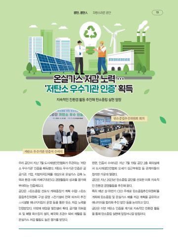 %uc6b0%ub9ac %uacf5%ub2e8%uc774 %uc9c0%ub09c 7%uc6d4 %ub3c4%uc2dc%uc7ac%uc0dd%uc548%uc804%ud611%ud68c%uac00 %uc8fc%uad00%ud558%ub294 %u2018%uc800%ud0c4%uc18c %uc6b0%uc218%uae30%uad00%u2019 %uc778%uc99d%uc744 %ud68d%ub4dd%ud588%ub2e4. %uc800%ud0c4%uc18c %uc6b0%uc218%uae30%uad00 %uc778%uc99d%uc740 %uacf5%uacf5%uae30%uad00, %uae30%uc5c5, %uc9c0%ubc29%uc790%uce58%ub2e8%uccb4%ub97c %ub300%uc0c1%uc73c%ub85c %uc628%uc2e4%uac00%uc2a4 %uac10%ucd95 %ub178%ub825%uacfc %ud658%uacbd%u00b7%uc0ac%ud68c%u00b7%uc9c0%ubc30%uad6c%uc870(ESG) %uacbd%uc601%ud65c%ub3d9%uc758 %uc131%uacfc%ub97c %ud3c9%uac00%ud574 %ubd80%uc5ec%ud558%ub294 %uc778%uc99d%uc81c%ub3c4%ub2e4.%uacf5%ub2e8%uc740 %u25b3%ud0c4%uc18c%uc911%ub9bd %uc120%ud3ec%uc2dd %uac1c%ucd5c(%uc911%uc7a5%uae30 %uacc4%ud68d %uc218%ub9bd) %u25b3%ud0c4%uc18c%uc911%ub9bd%ucd94%uc9c4%uc704%uc6d0%ud68c %uad6c%uc131%u00b7%uc6b4%uc601 %u25b3%uc804%uae30%uc124%ube44 %uc804%ub825 %ud53c%ud06c%uce58 %ucd94%uc9c4 %u25b3%uc2dc%uc124%ubcc4 %uc5d0%ub108%uc9c0%uc9c0%ud0b4%uc774 %uc6b4%uc601 %ub4f1%uc744 %ud1b5%ud55c %ud0c4%uc18c %uc800%uac10 %ub178%ub825%uc744 %uc778%uc815%ubc1b%uc558%ub2e4. %uc774%ubc16%uc5d0 %ud0dc%uc591%uad11 %ubc1c%uc804%uc124%ube44 %ud655%ub300, %uacf5%uae30%uc5f4 %ud788%ud2b8%ud38c%ud504 %ubc0f %ud3d0%uc5f4 %ud68c%uc218%uc7a5%uce58 %uc124%uce58, %ud3d0%uad6d%ud654 %uc870%uacbd%uc218 %ud1f4%ube44 %uc7ac%ud65c%uc6a9 %ub4f1 %uc628%uc2e4%uac00%uc2a4 %uc800%uac10 %ud65c%ub3d9%ub3c4 %ub192%uc740 %ud3c9%uac00%ub97c %ubc1b%uc558%ub2e4.%ud55c%ud3b8, %uc778%uc99d%uc11c %uc218%uc5ec%uc2dd%uc740 %uc9c0%ub09c 7%uc6d4 19%uc77c %uacf5%ub2e8 2%uce35 %ud68c%uc758%uc2e4%uc5d0%uc11c %ub3c4%uc2dc%uc7ac%uc0dd%uc548%uc804%ud611%ud68c %uc624%uc138%uae30 %uc0c1%uadfc%ubd80%ud68c%uc7a5 %ub4f1 %uad00%uacc4%uc790%ub4e4%uc774 %ucc38%uc11d%ud55c %uac00%uc6b4%ub370 %uc5f4%ub838%ub2e4. %uacf5%ub2e8%uc740 %uc9c0%ub09c 2023%ub144 %ud0c4%uc18c%uc911%ub9bd %uacf5%ub2e8%uc744 %uc120%ud3ec%ud55c %uc774%ud6c4 %uc9c0%uc18d%uc801%uc778 %uce5c%ud658%uacbd %uacbd%uc601%ud65c%ub3d9%uc744 %ucd94%uc9c4%ud574 %uc654%ub2e4. %ud2b9%ud788 %ub9e4%ub144 %uc0c1%u00b7%ud558%ubc18%uae30 CEO %uc8fc%uc7ac%ub85c %ud0c4%uc18c%uc911%ub9bd%ucd94%uc9c4%uc704%uc6d0%ud68c%u2019%ub97c %uac1c%ucd5c%ud574 %ud0c4%uc18c%uc911%ub9bd %ubc0f %uc628%uc2e4%uac00%uc2a4 %ubc30%ucd9c %uc800%uac10 %uacc4%ud68d%uc744 %uacf5%uc720%ud558%uace0 %uc5d0%ub108%uc9c0%uc774%uc6a9 %ud569%ub9ac%ud654 %ucd94%uc9c4 %ubc29%uc548 %ub4f1%uc744 %ub17c%uc758%ud558%uace0 %uc788%ub2e4. %uacf5%ub2e8%uc740 %uc774%ubc88 %uc800%ud0c4%uc18c %uc778%uc99d%uc744 %uacc4%uae30%ub85c %uc9c0%uc18d%uc801%uc778 %uce5c%ud658%uacbd %ud65c%ub3d9%uc744 %ud1b5%ud574 %ud0c4%uc18c%uc911%ub9bd %uc2e4%ud604%uc5d0 %uc55e%uc7a5%uc11c%ub098%uac08 %ubc29%uce68%uc774%ub2e4.%uc628%uc2e4%uac00%uc2a4 %uc800%uac10 %ub178%ub825 %u2026 %u2018%uc800%ud0c4%uc18c %uc6b0%uc218%uae30%uad00 %uc778%uc99d%u2019 %ud68d%ub4dd%uc9c0%uc18d%uc801%uc778 %uce5c%ud658%uacbd %ud65c%ub3d9 %ucd94%uc9c4%ud574 %ud0c4%uc18c%uc911%ub9bd %uc2e4%ud604 %uc55e%uc7a5%uc800%ud0c4%uc18c %uc6b0%uc218%uae30%uad00 %uc778%uc99d%uc11c %uc218%uc5ec%uc2dd%ud0c4%uc18c%uc911%ub9bd%ucd94%uc9c4%uc704%uc6d0%ud68c %ud68c%uc758%uacf5%ub2e8, %uacf5%ub2e8%u4eba %uc790%ub791%uc2a4%ub7ec%uc6b4 %uacf5%ub2e8 13