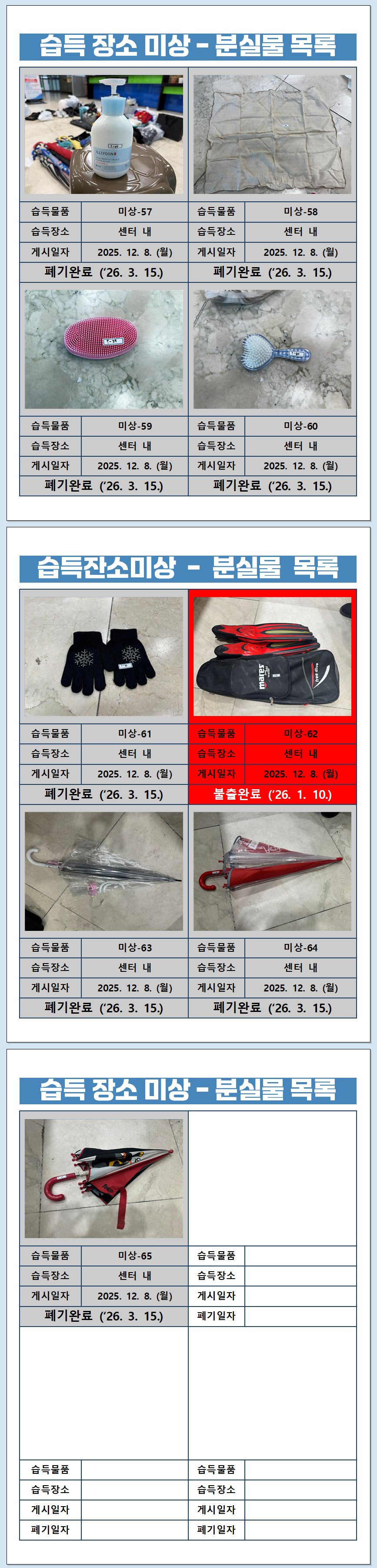 습득장소 미상 - 분실물 목록 (2025)_③ / '26. 3. 15. (일) 폐기 완료