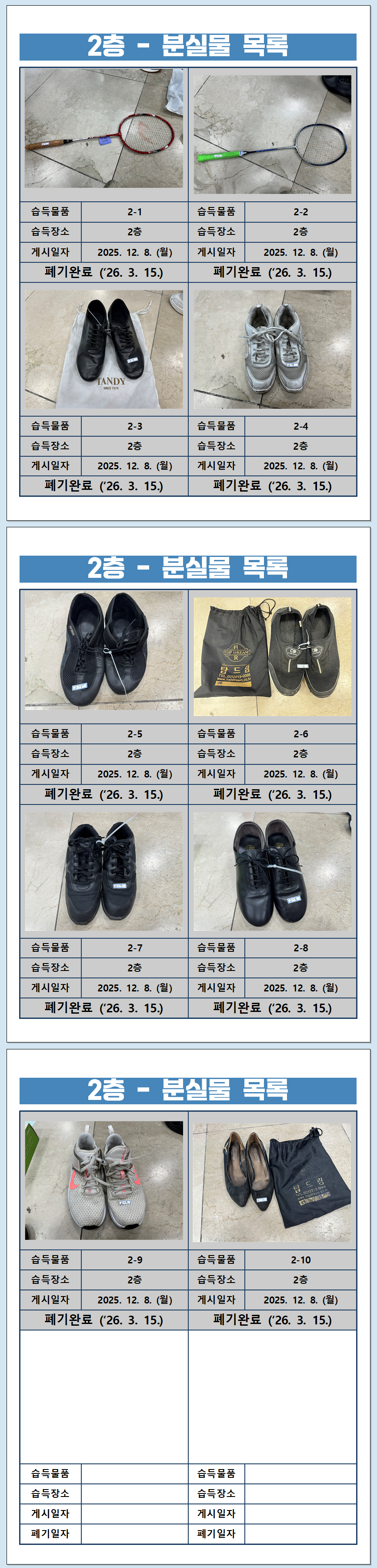 2층 - 분실물 목록 (2025) / '26. 3. 15. (일) 폐기 완료