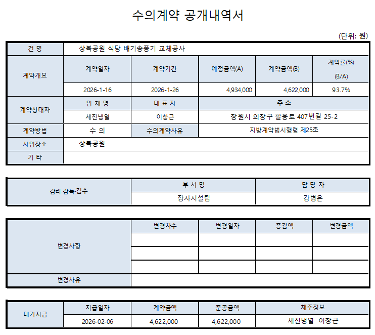 창원상복공원 상복공원 식당 배기송풍기 교체공사 작성자 박진아 댓글 0건 조회 5회 작성일 2026-03-14 본문 목록 이전글늘푸른전당 소방시설 노후설비 교체공사 26.03.14 다음글방역 용역 26.03.14