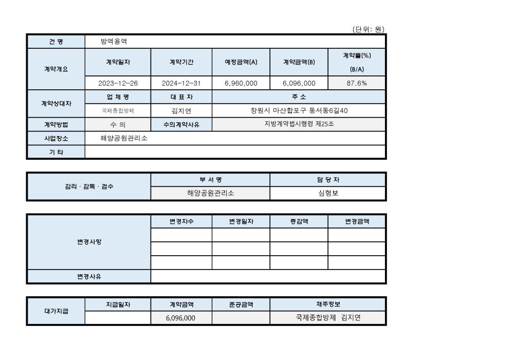 진해해양공원 해양공원팀 방역 용역 작성자 조정화 댓글 0건 조회 2,919회 작성일 2024-02-29 본문 목록 이전글우리누리청소년문화센터 방역 용역 24.02.29 다음글창원국제사격장 방역 용역 24.02.29