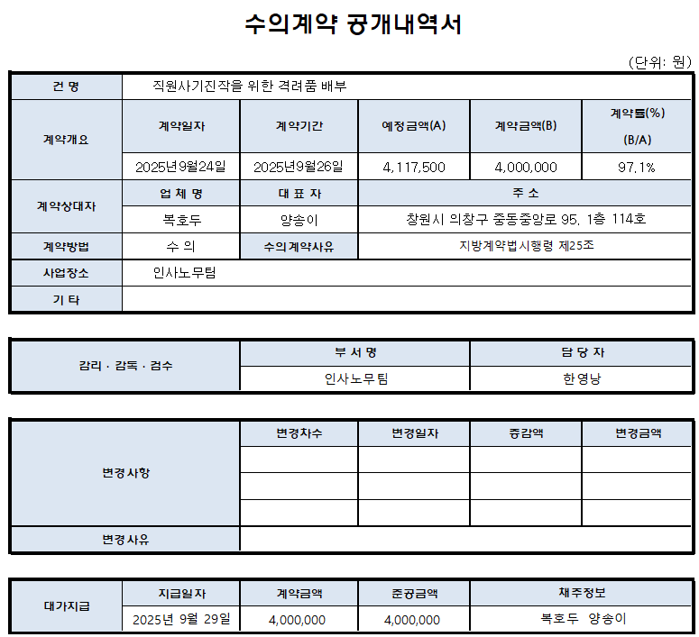 전체 [인사노무팀] 직원사기진작을 위한 격려품 구입 작성자 박진아 댓글 0건 조회 125회 작성일 2025-10-09 본문 목록 이전글근무복(장례식장 및 봉안당) 구입 25.10.09 다음글창원스포츠파크팀 / 창원시티투어 2층 버스(9810호) 계단 출입문 구입 25.09.30