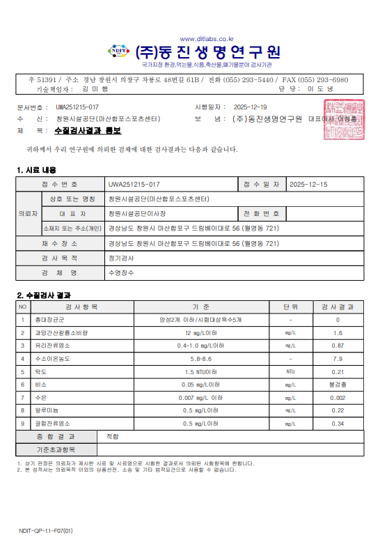 12월 10일 (수) 수영장수 유충검사 결과: 이상없음