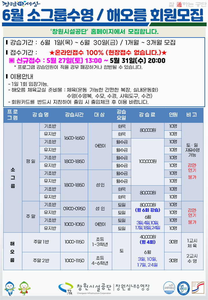 창원실내수영장 6월 프로그램 운영 안내(5/24 수정게시)