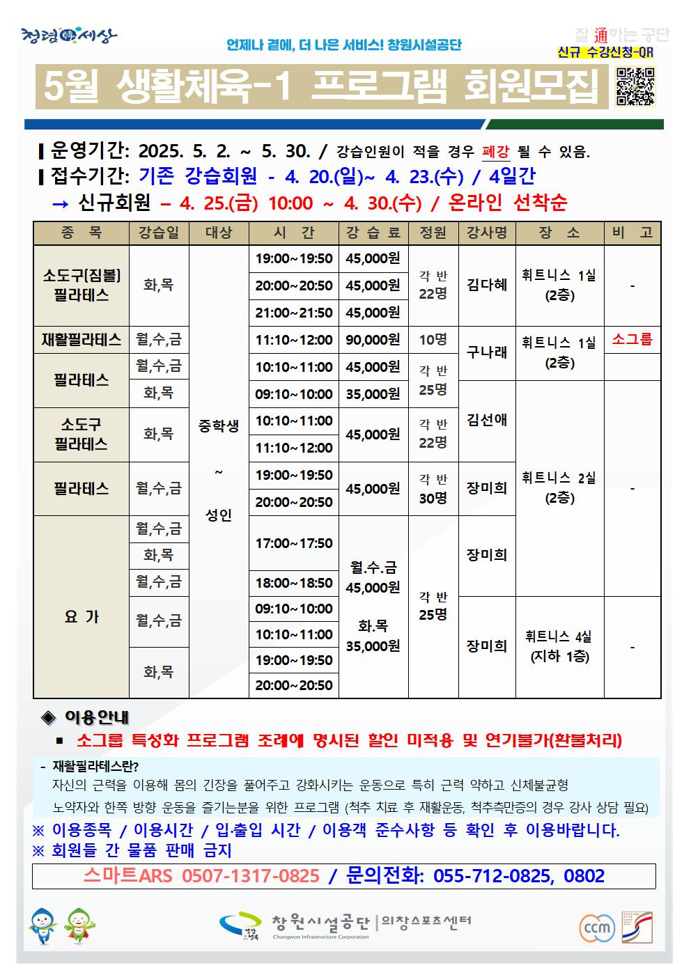 창원축구센터 5월 프로그램 운영 안내 (축구교실,헬스장,탁구,배드민턴)