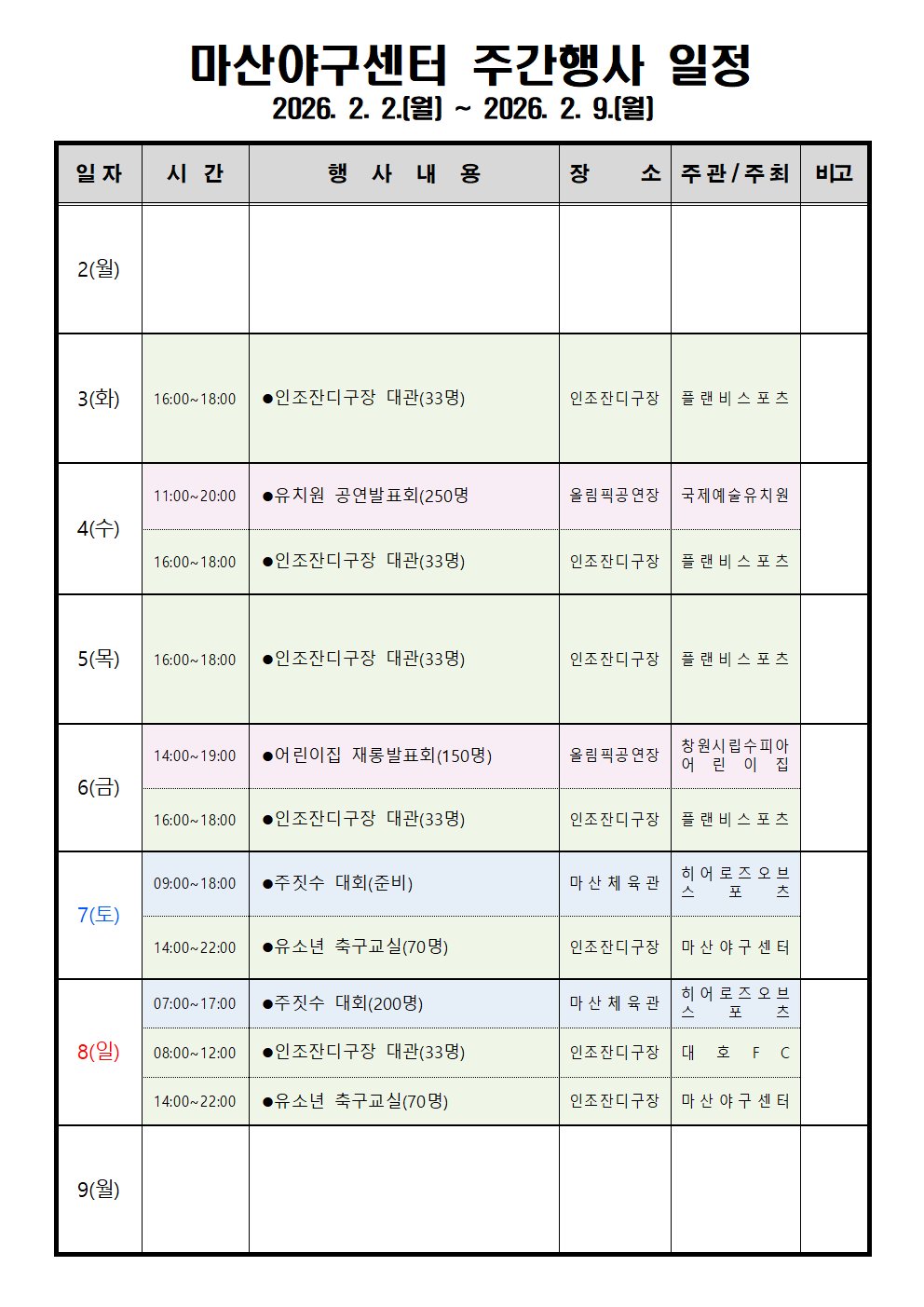 마산야구센터 주간행사일정2026. 2. 2. ~ 2026. 2. 9..hwp