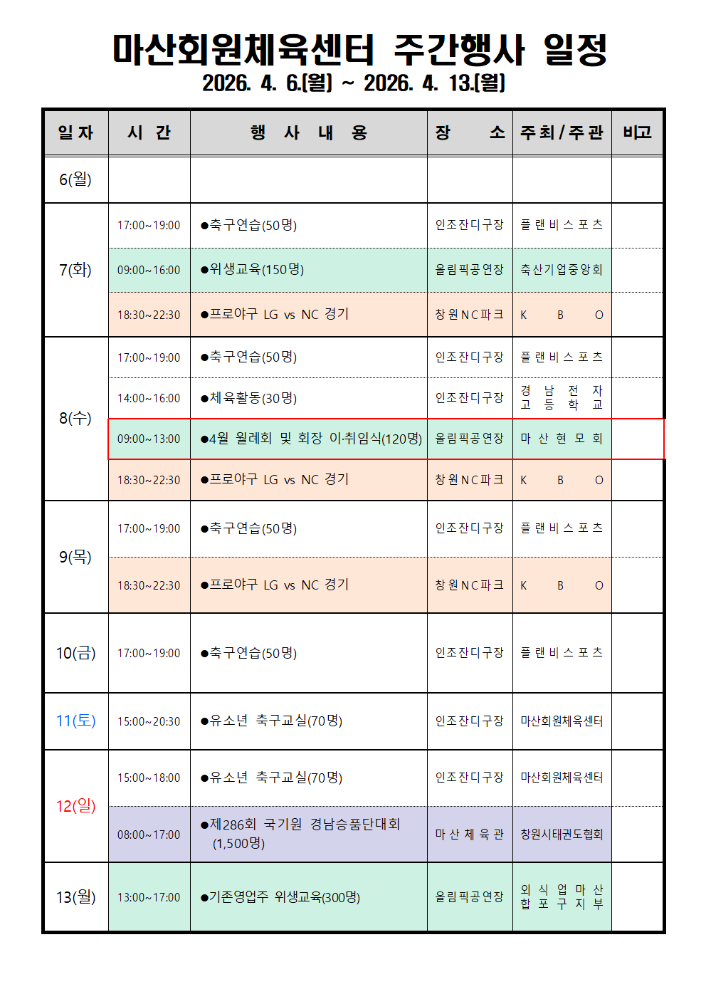 [추가]마산회원체육센터 주간행사일정2026. 4. 6. ~ 2026. 4. 13..hwp