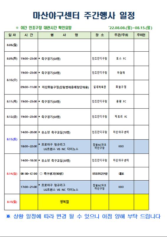 마산야구센터 주간행사일정