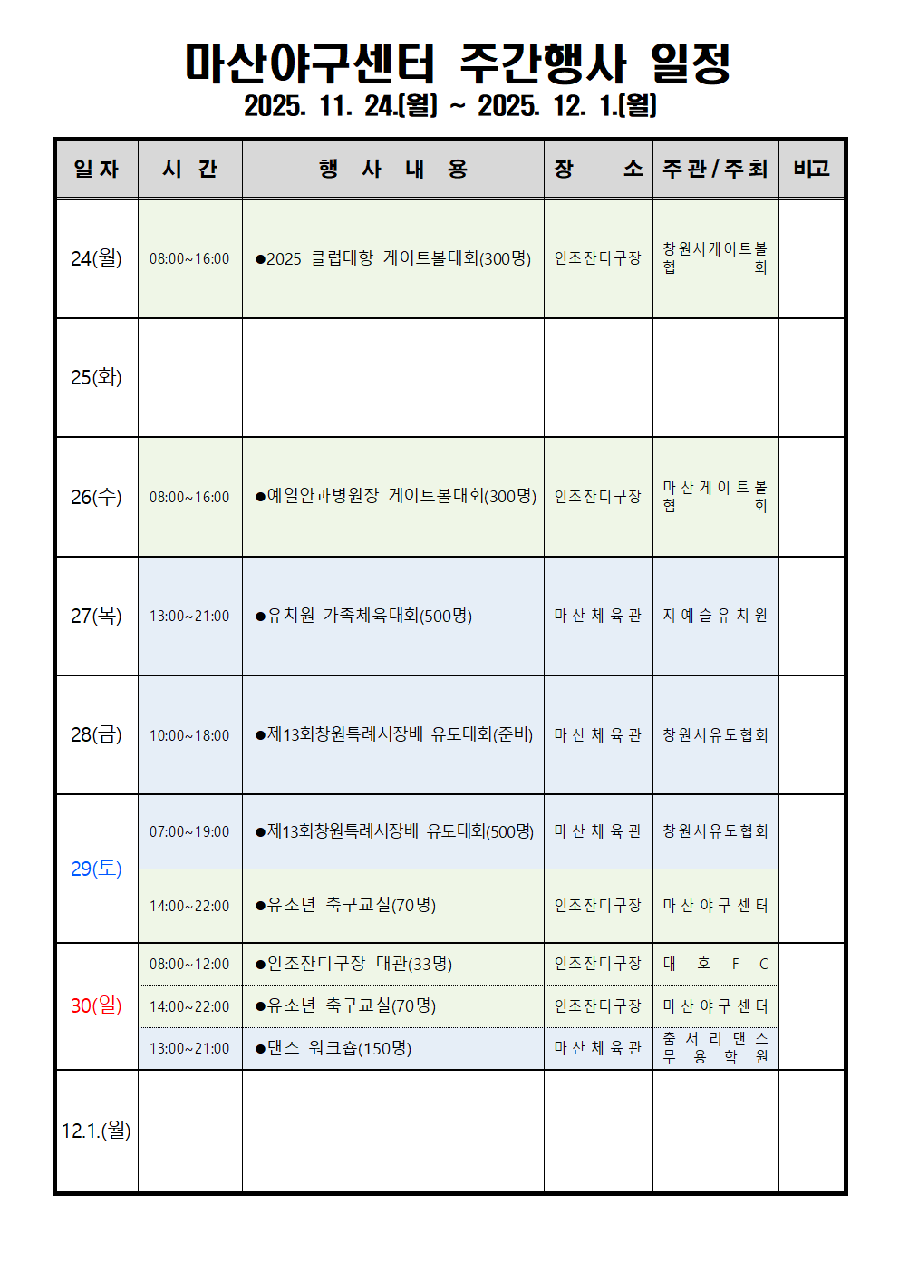 마산야구센터 주간행사일정2025. 11. 24. ~ 2025. 12. 1..hwp