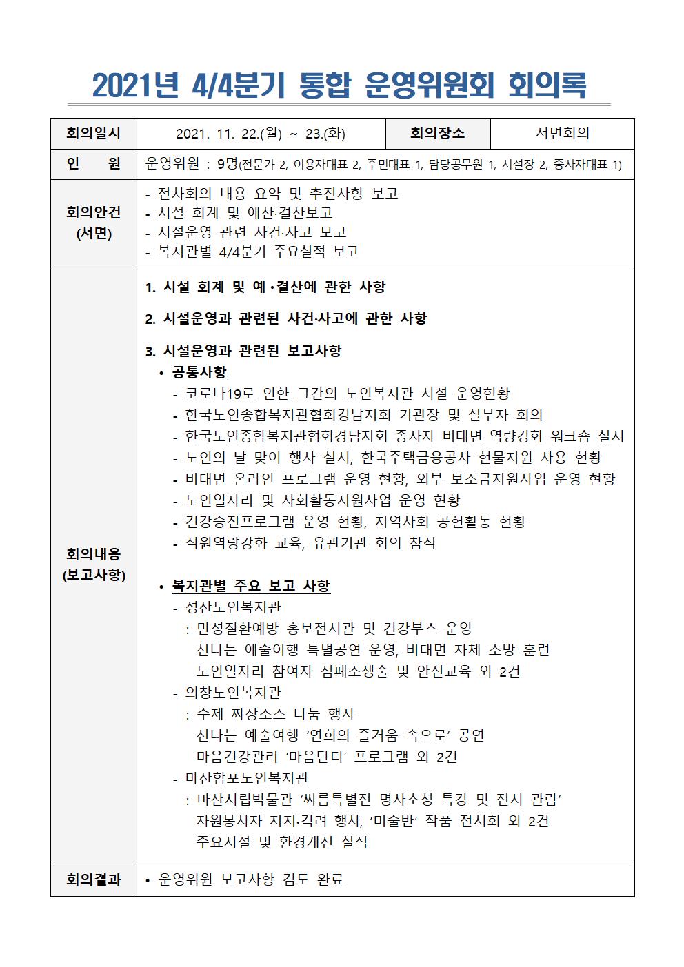 2021년 4/4분기 통합 노인복지관 운영위원회 결과