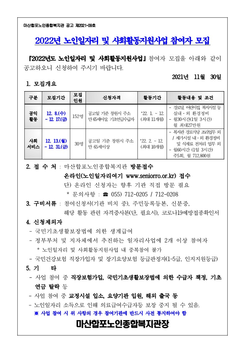 2022년 노인일자리 및 사회활동지원사업 참여자 모집