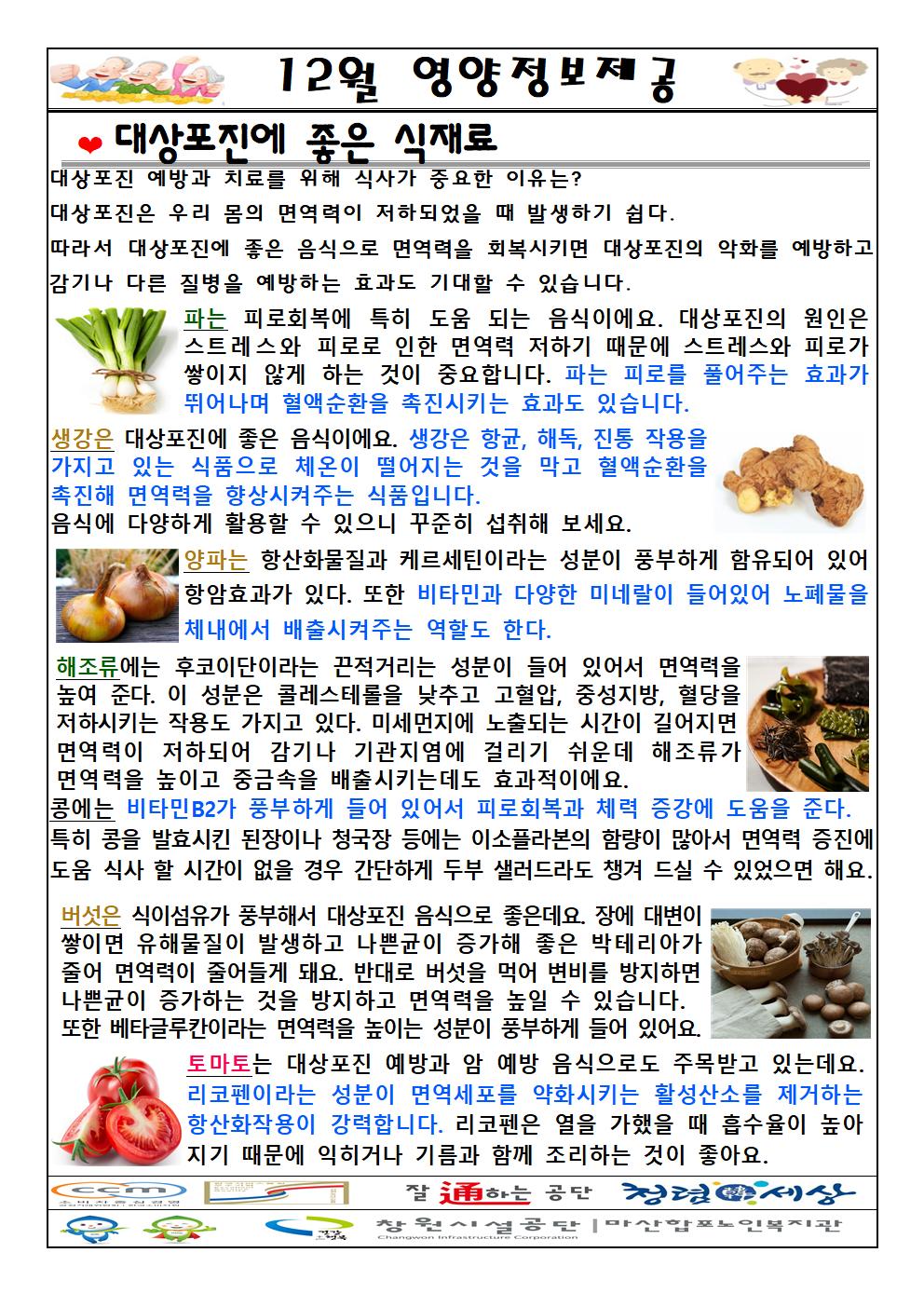 복지관 이용 어르신들을 위해 2021년 12월 영양정보 - "대상포진에 좋은 식재료(과일·채소)"에 대해 알려드립니다.
