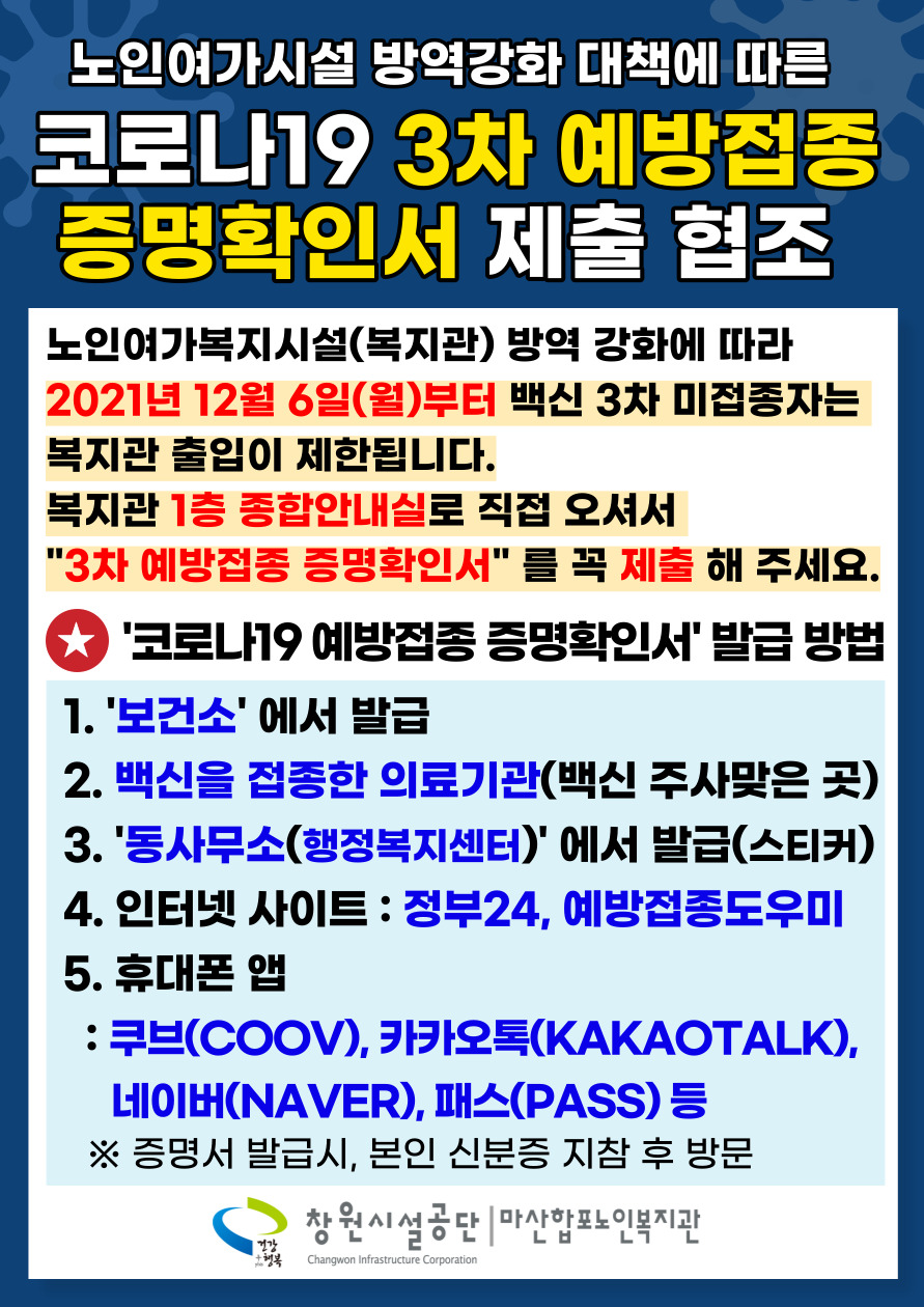 코로나19 예방접종 3차 접종완료자만 복지관 출입 및 이용 가능