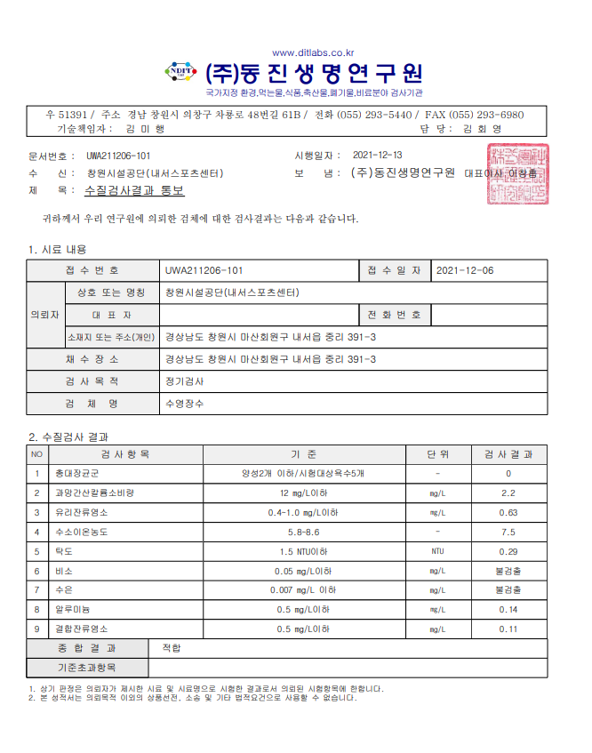 12월 수영장 수질검사 결과 안내