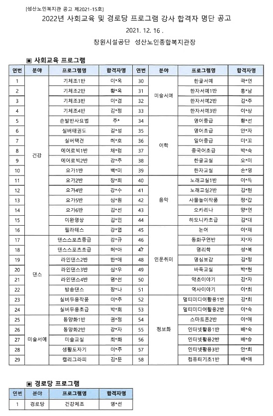 2022년 성산노인복지관 사회교육 및 경로당 프로그램 강사 합격자 명단을 아래와 같이 공고합니다.