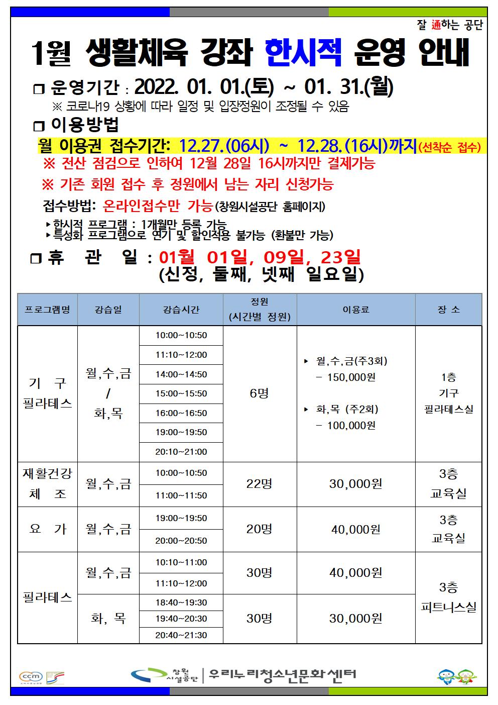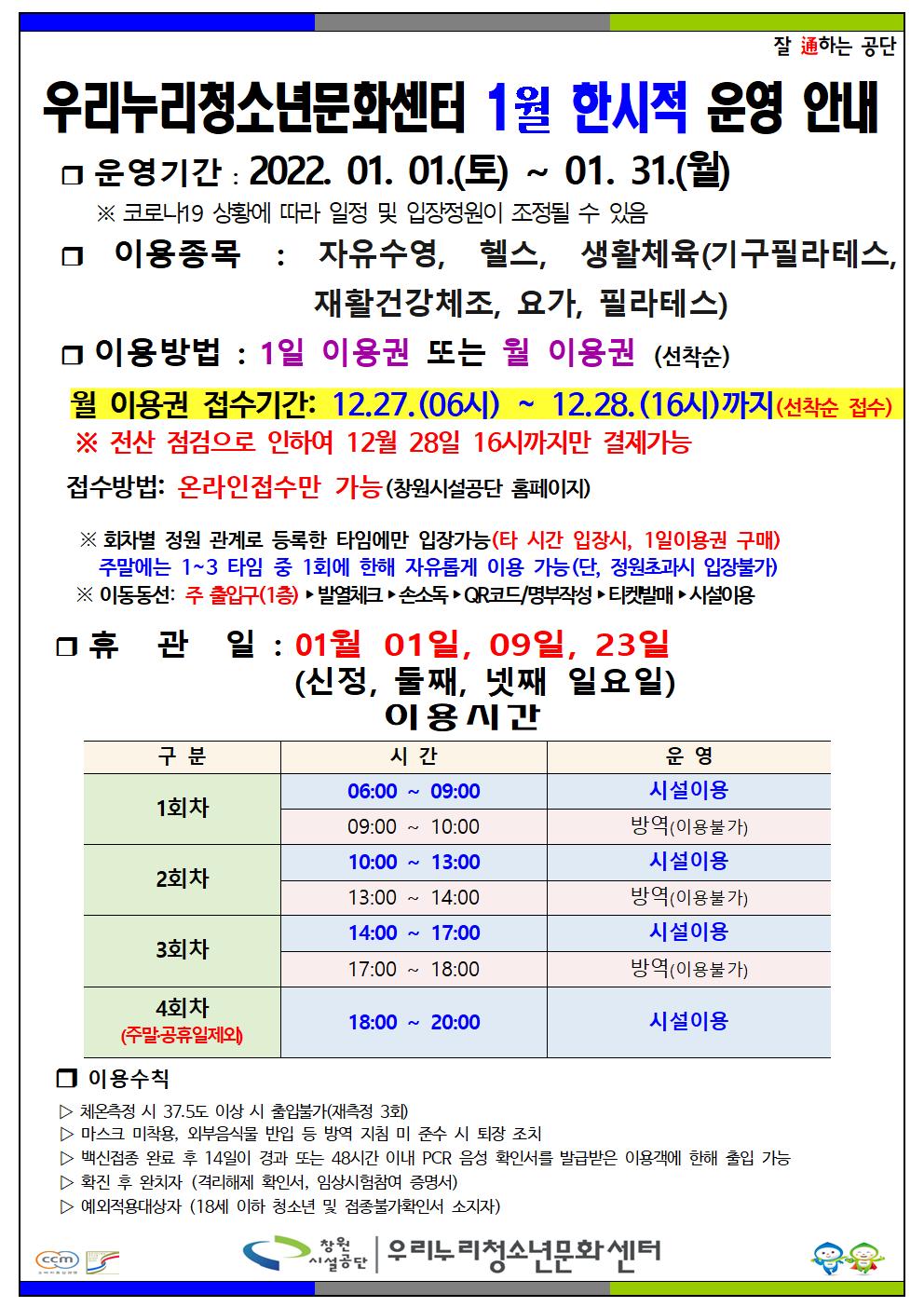 우리누리청소년문화센터 1월 한시적 운영 안내