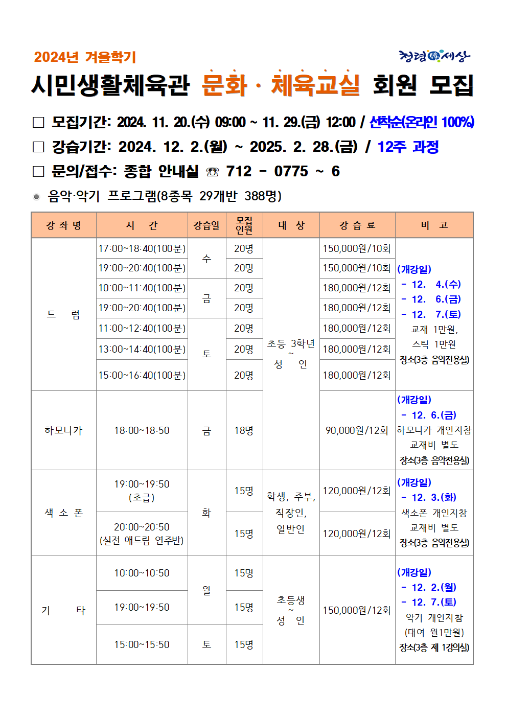 | 기타 | 10:00~10:50 | 월 | 15명 | 초등생 ~ 성인 | 150,000원/12회 | (개강일) -12. 2.(월) -12. 7.(토) 악기 개인지참(대여 월1만원) 장소(3층 제 1강의실) |