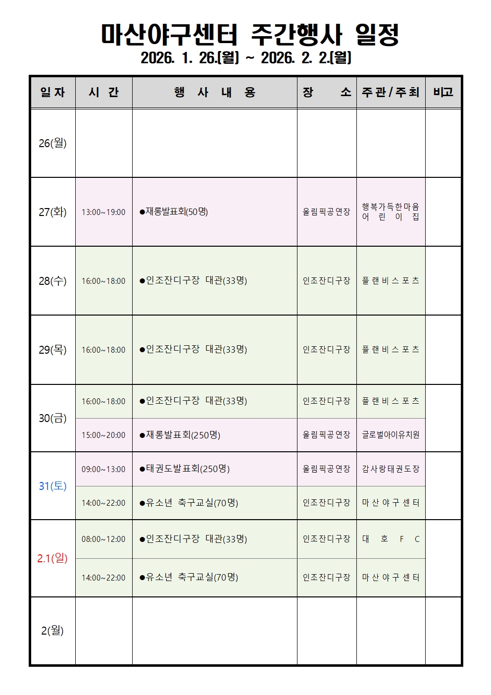 마산야구센터 주간행사일정2026. 1. 26. ~ 2026. 2. 2. 1.hwp