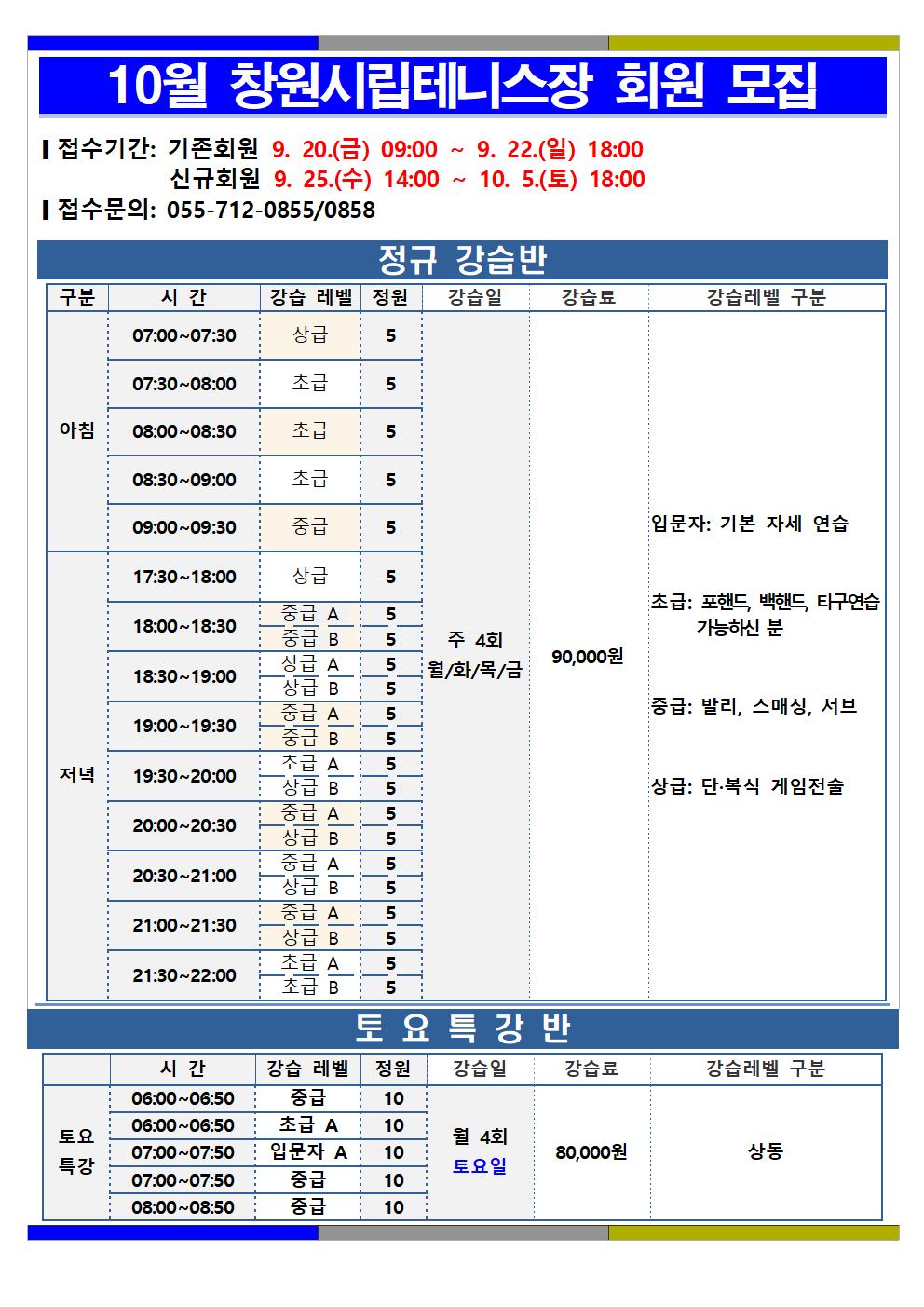 창원시립테니스장 10월 테니스 강습 회원 모집 안내