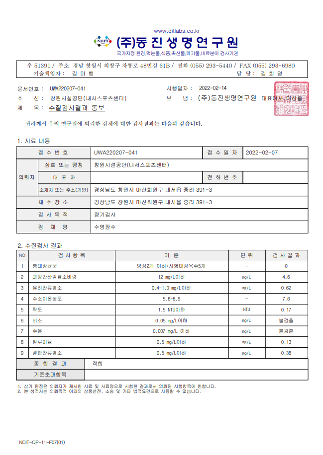 2월 수영장 수질검사 결과안내