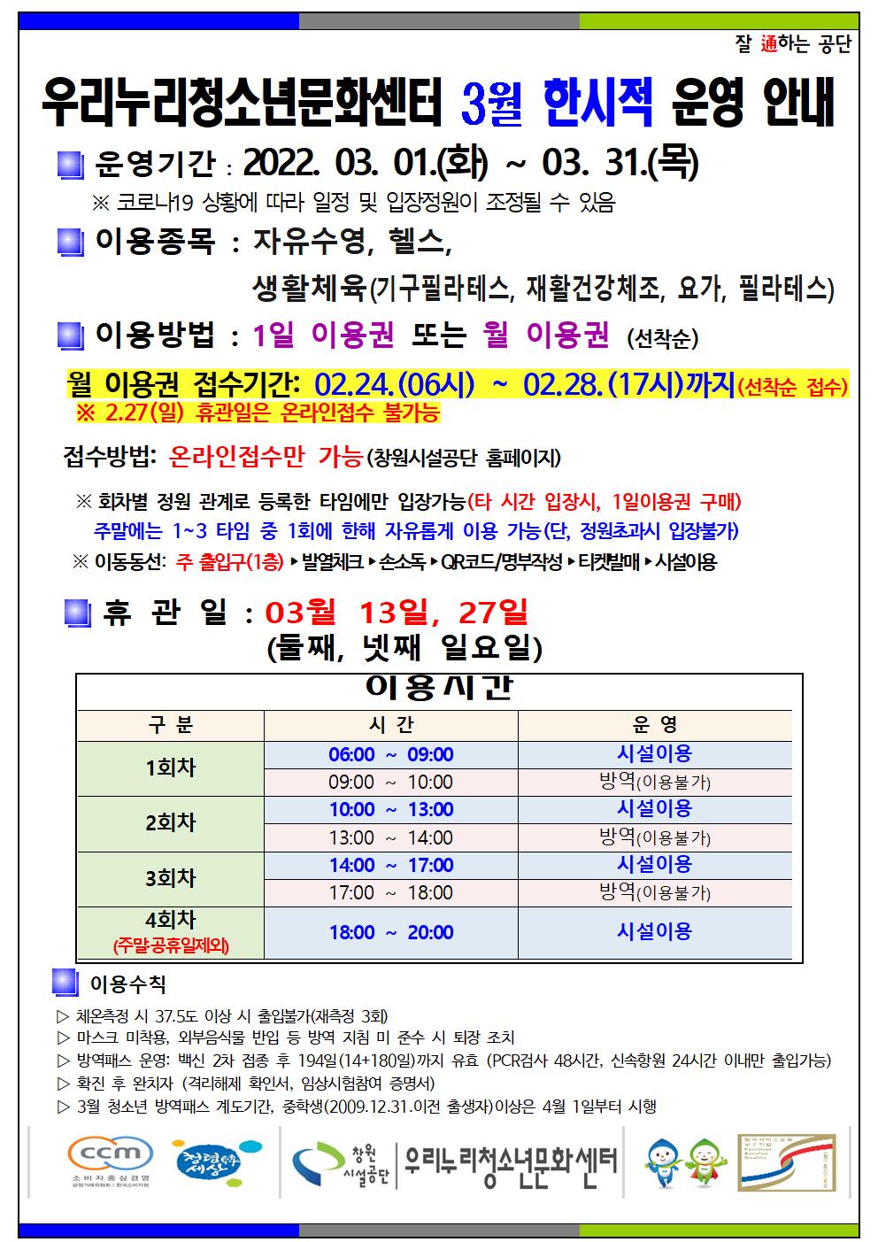 우리누리청소년문화센터 3월 한시적 운영 안내