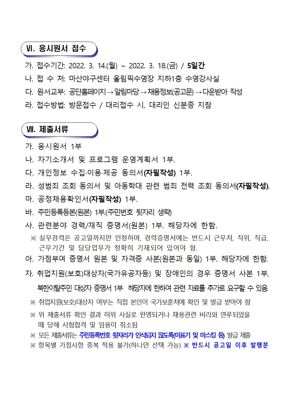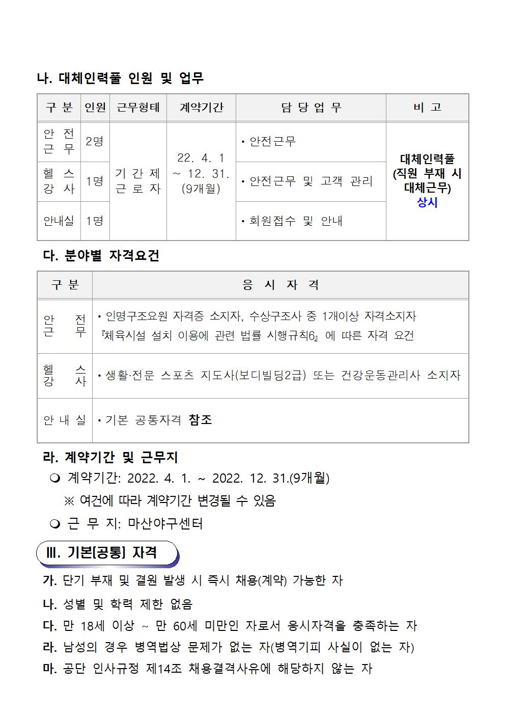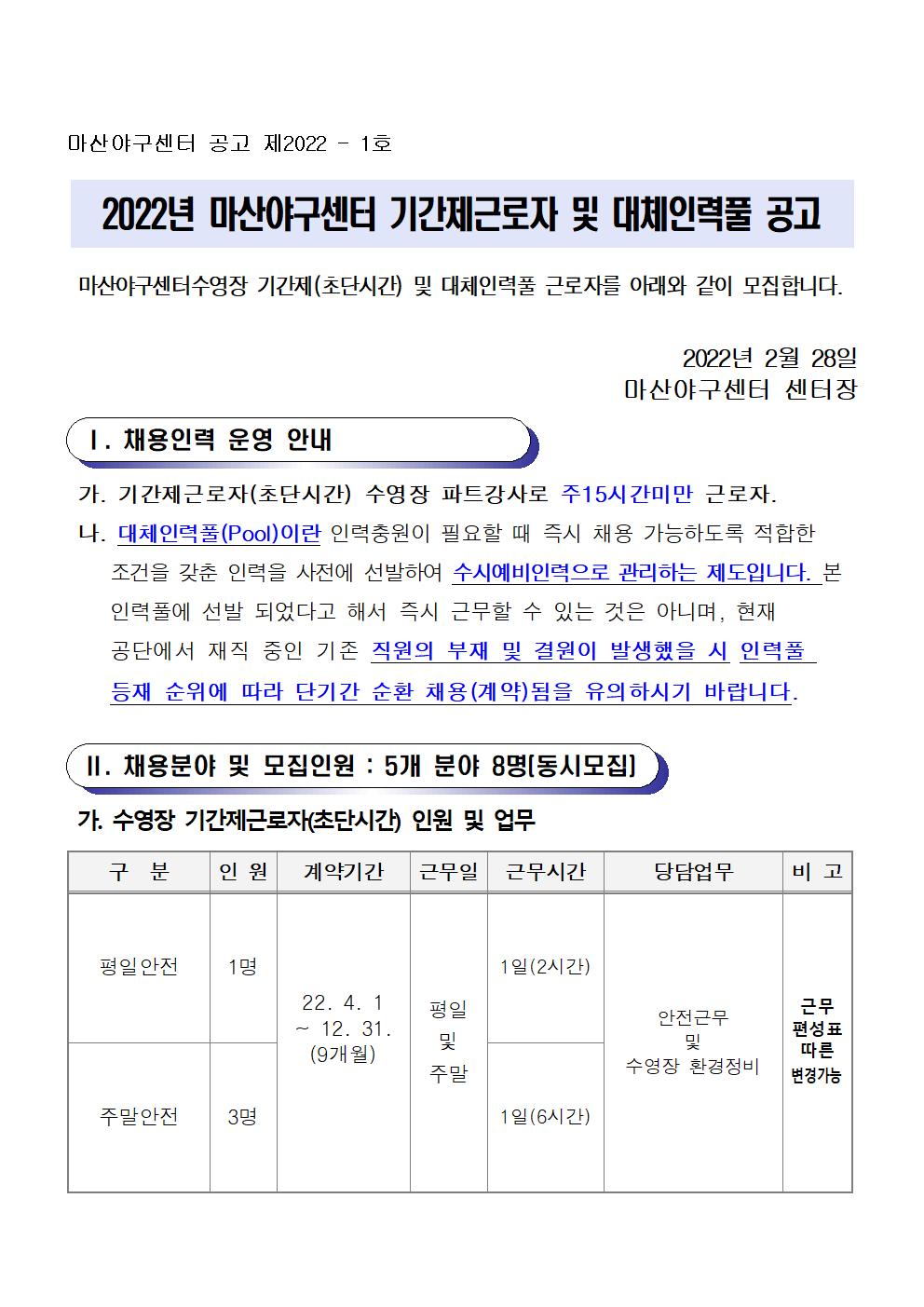 [마산야구센터]2022년 기간제(초단시간) 및 대체인력풀 모집 공고