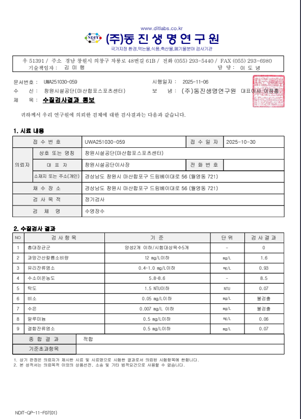 11월 6일 수질검사 결과 이상무