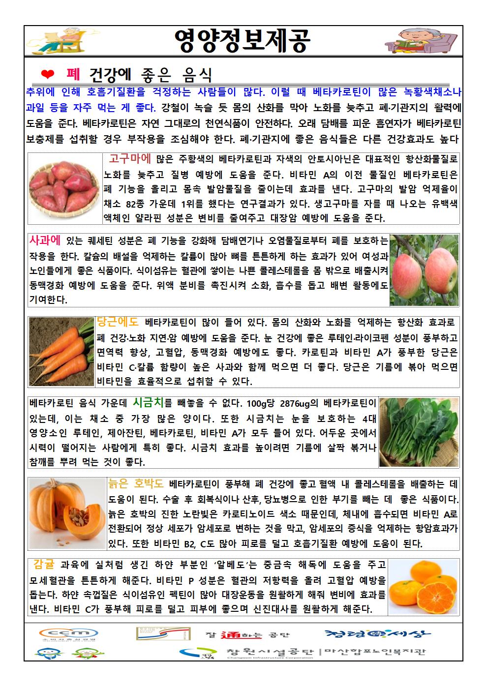 복지관 이용 어르신들을 위해 2022년 1월 영양정보 - "폐 건강에 좋은 음식(과일·채소)"에 대해 알려드립니다.