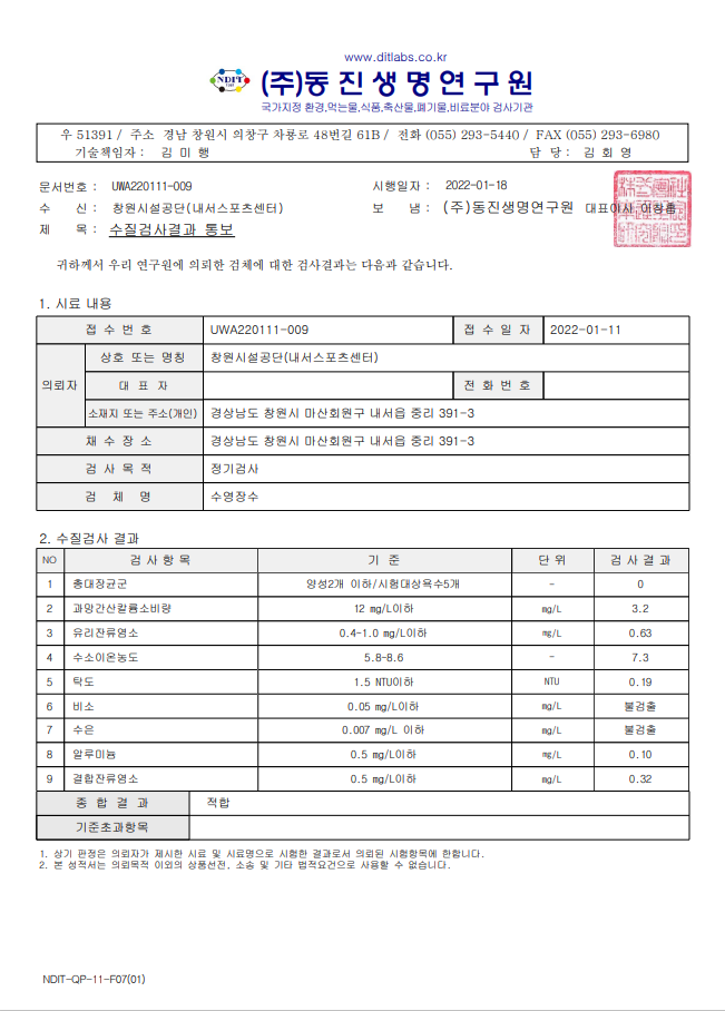1월 수영장 수질검사 결과 안내