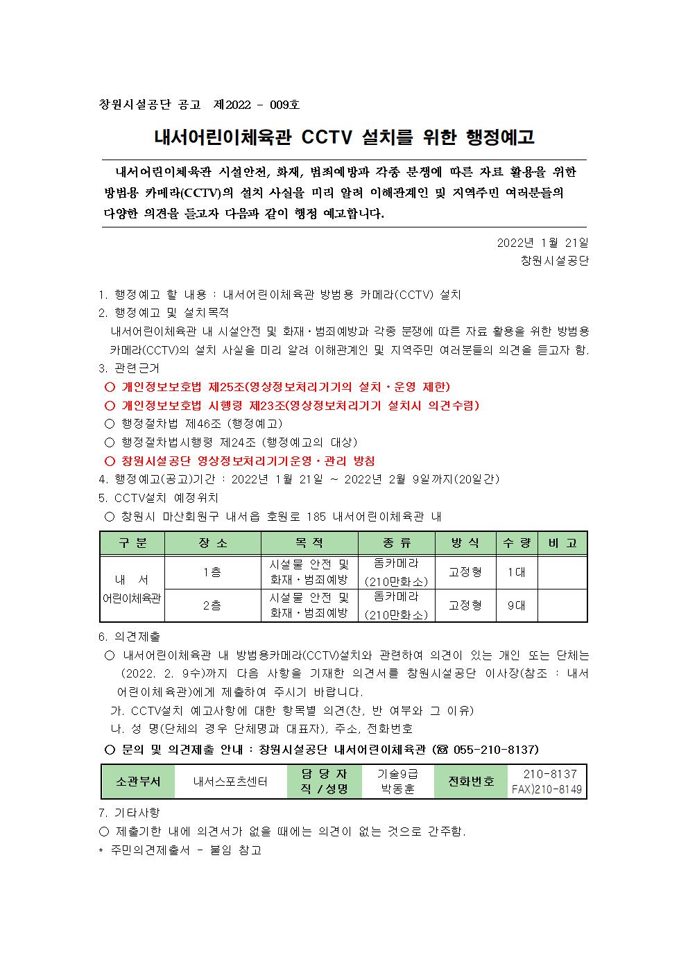 내서어린이체육관 CCTV 설치를 위한 행정예고