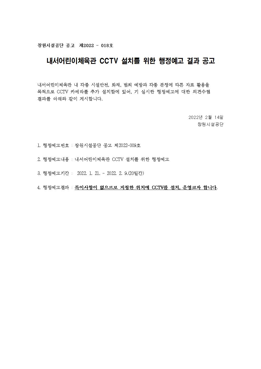 내서어린이체육관 CCTV 설치를 위한 행정예고 결과 보고