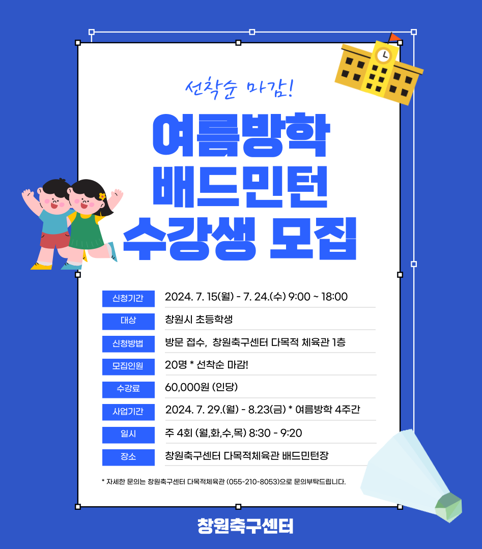 창원축구센터 2024년 여름방학특강 배드민턴교실 접수안내(체육관)