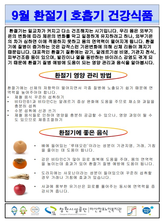 복지관 이용 어르신들을 위해 2022년 9월 영양정보 - "환절기 호흡기 예방에 좋은 음식"에 대해 알려드립니다.