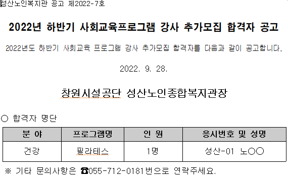 2022년 하반기 사회교육프로그램(필라테스) 강사 추가모집 최종합격자 공고 상세보기