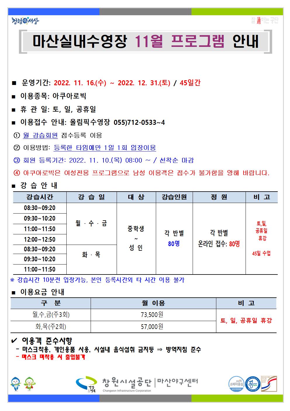 11월 아쿠아로빅 모집 안내 입니다.