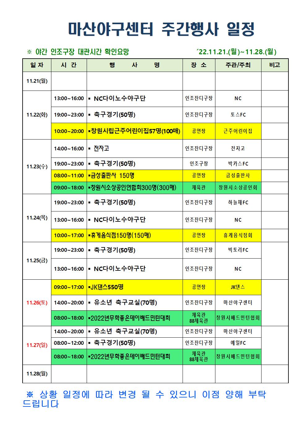 마산야구센터 주간행사 일정