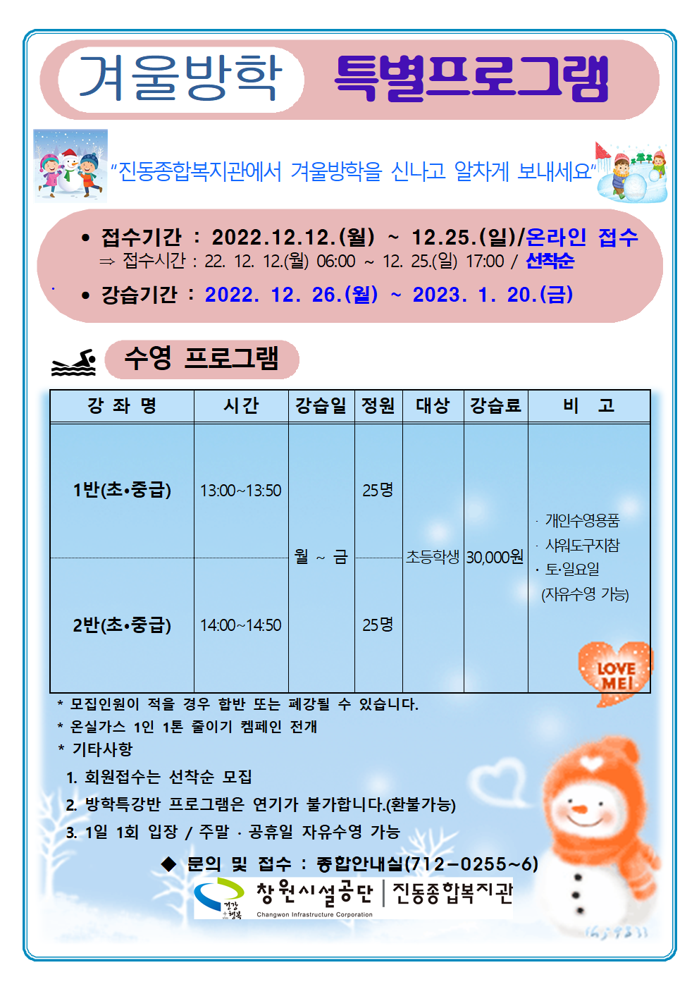 겨울방학 특별프로그램 회원 모집 안내 상세보기