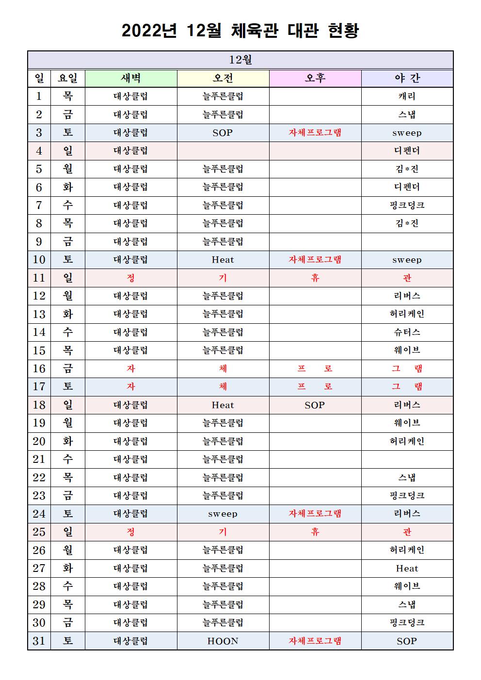 12월 늘푸른전당 체육관 대관 현황(변경) 상세보기