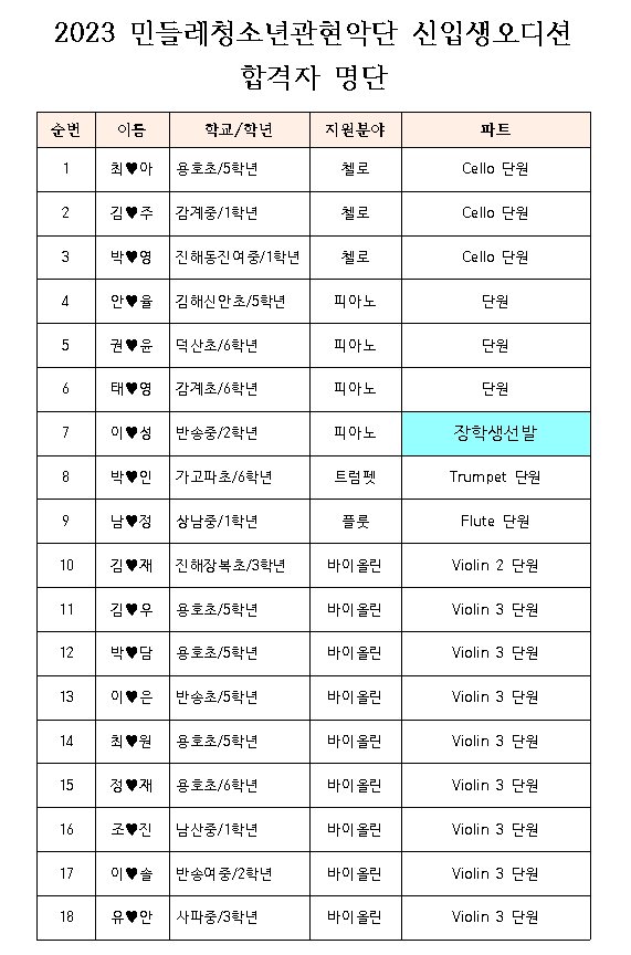 2023년 민들레청소년관현악단 신입생 오디션 합격자 발표