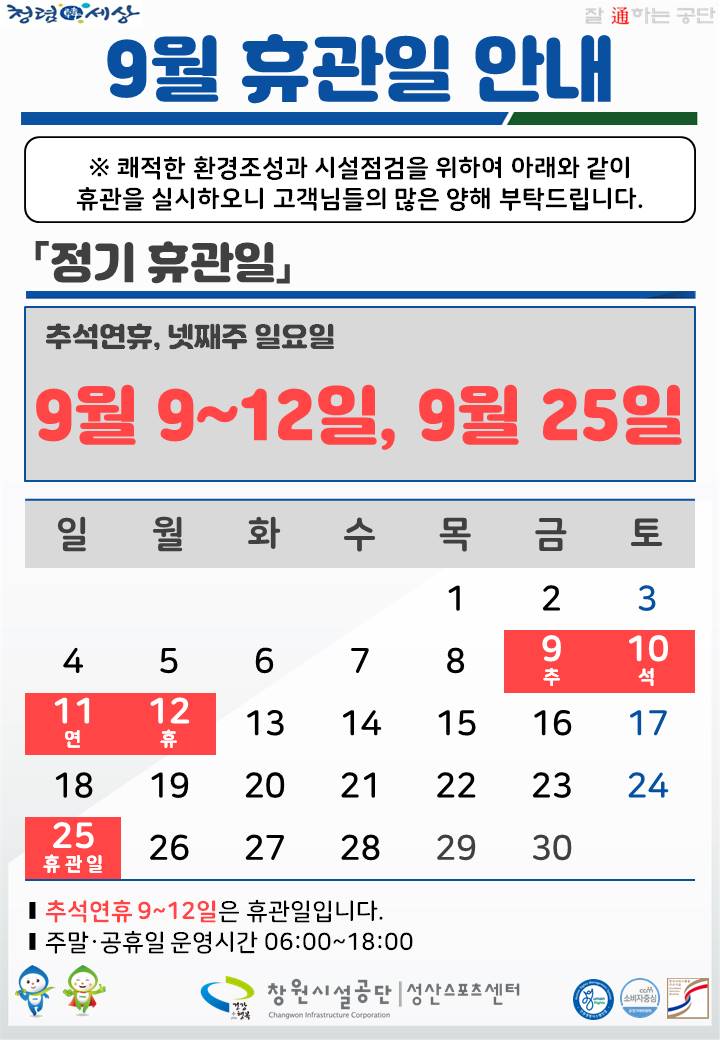 9월 추석연휴 및 정기휴관일 안내 상세보기
