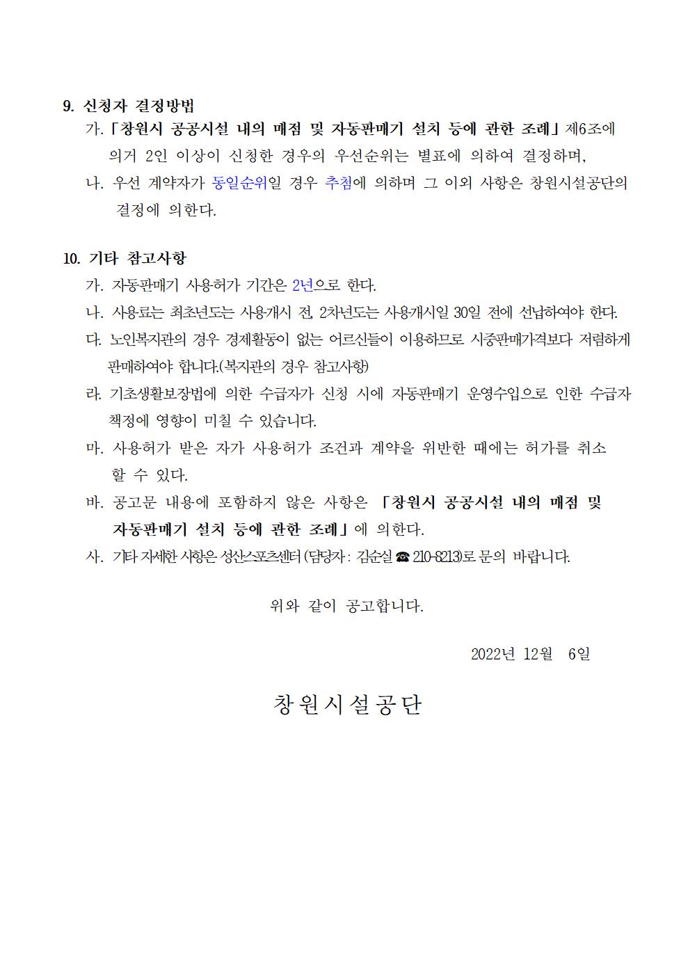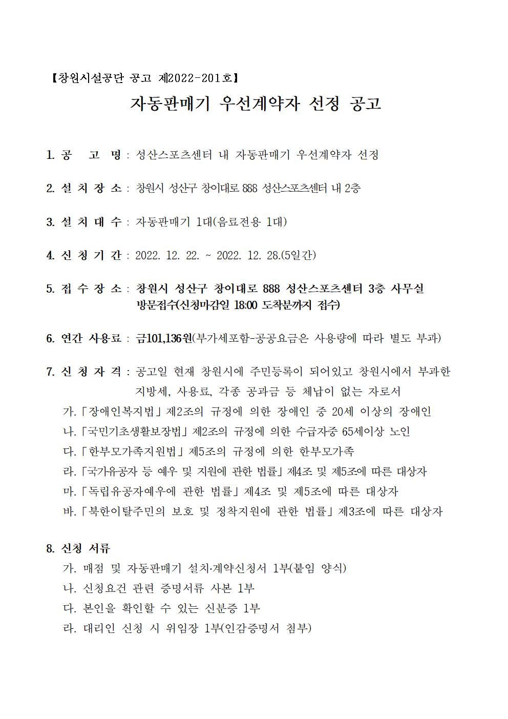 성산스포츠센터 자동판매기 우선계약자 선정공고