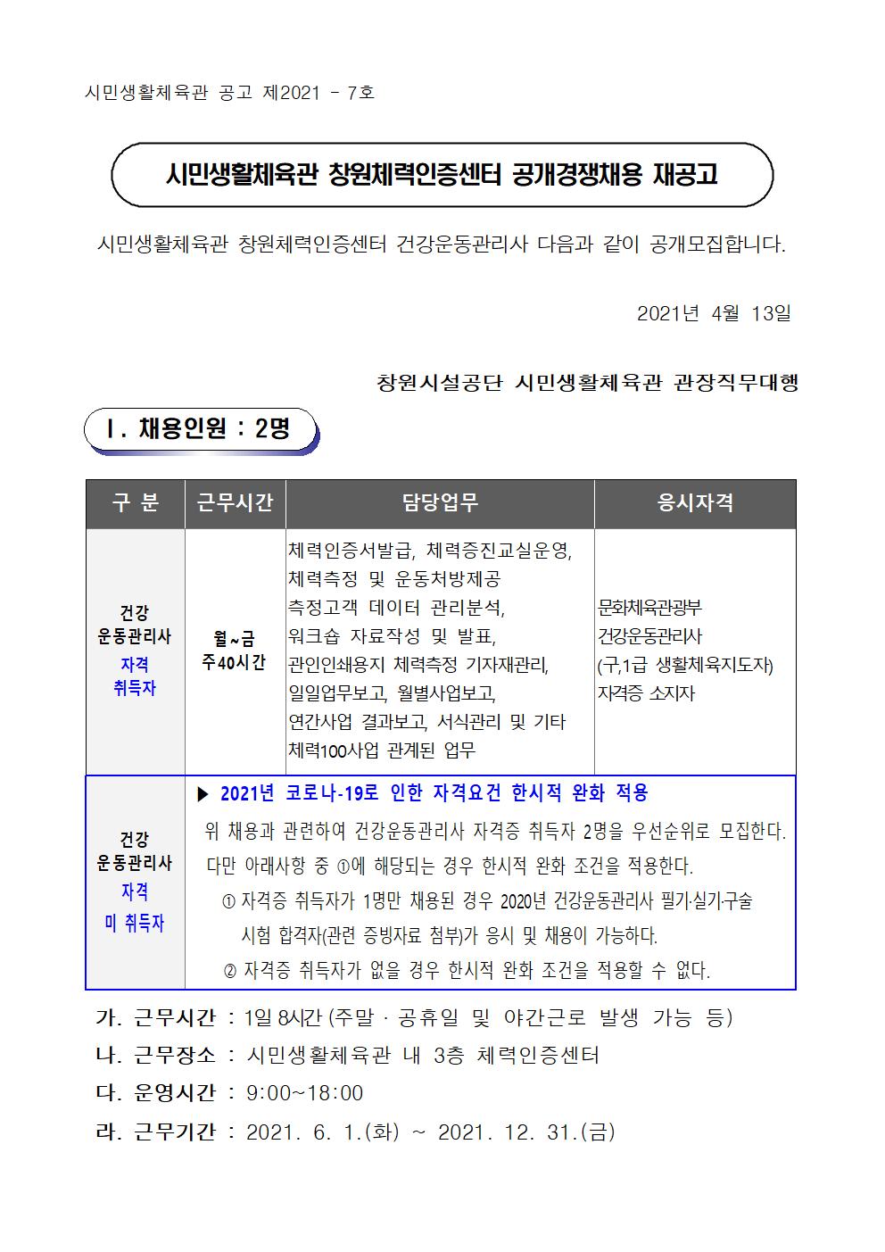 창원체력인증센터 공개경쟁채용 재공고
