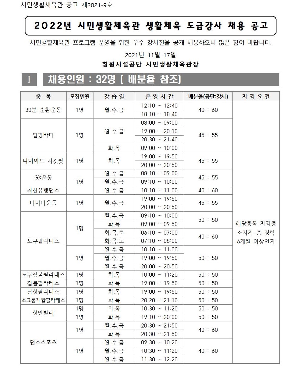 2022년 시민생활체육관 생활체육 도급강사 채용 공고 상세보기