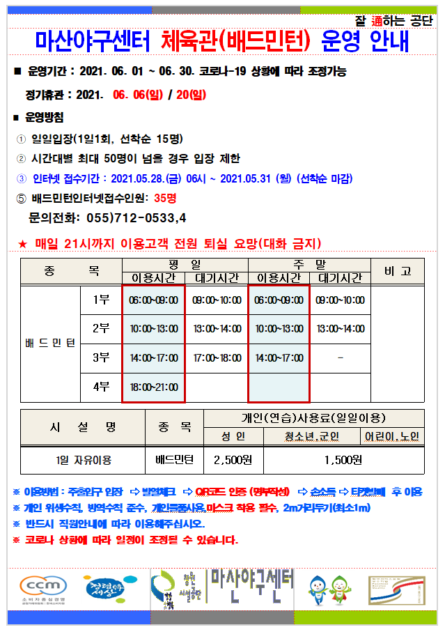 마산야구센터 체육관(배드민턴) 6월 운영 안내