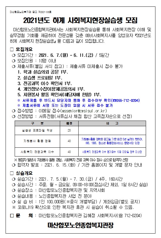 마산합포노인복지관 2021년 하계 사회복지 현장 실습생 모집 안내 공고입니다.