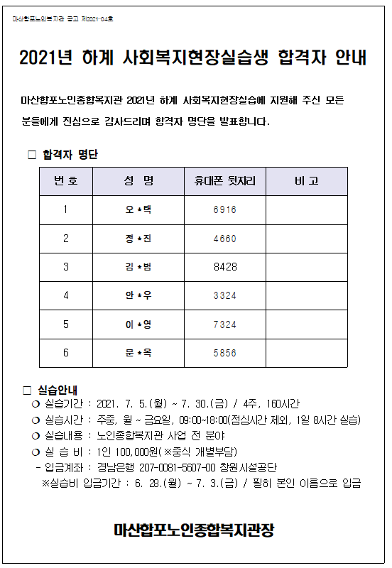 2021년 하계 사회복지현장실습생 합격자를 다음과 같이 안내 하오니 확인하시기 바랍니다.