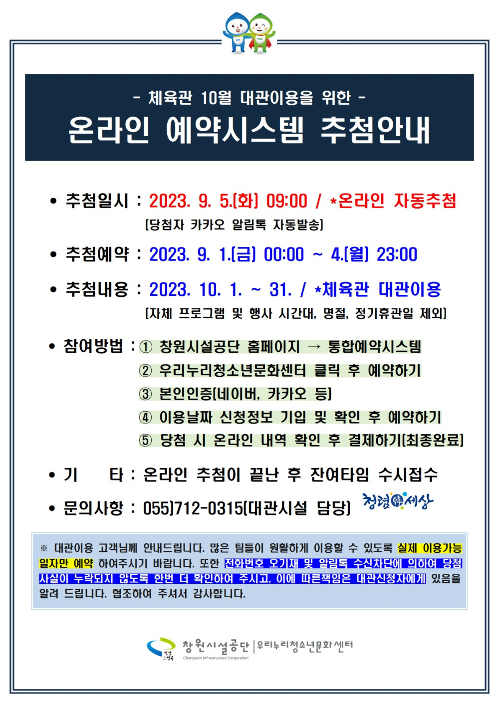 9월 체육관 대관 온라인 추첨(23.10월 이용분) 및 수시접수 안내